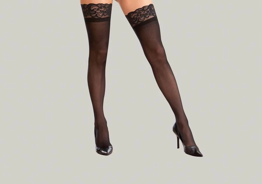 Sheer thigh high with stay up silicone lace top.