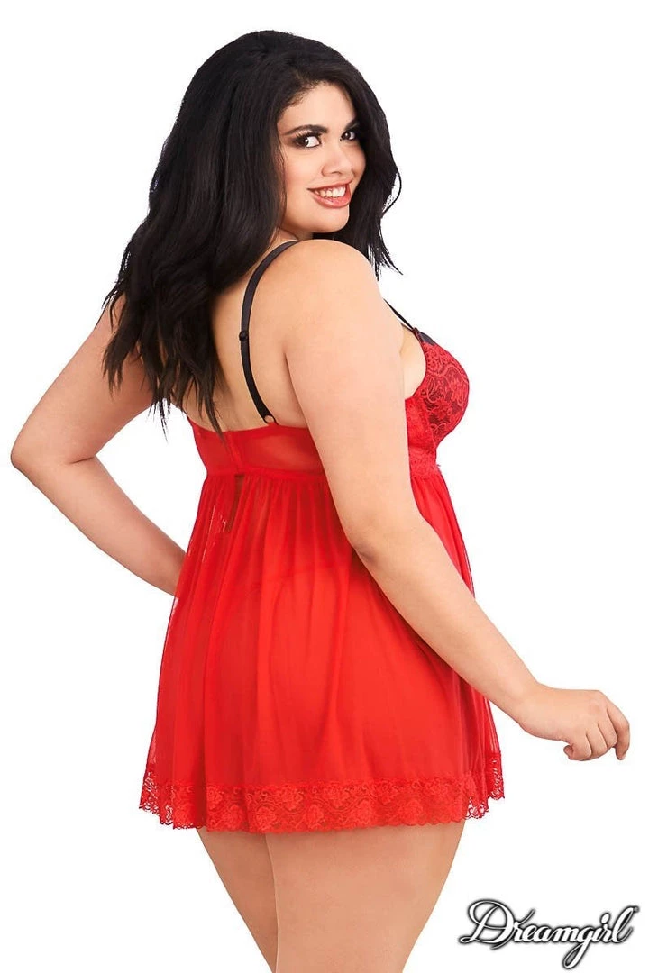 Stretch mesh and lace babydoll with underwire push-up cups, stretch satin and lace overlay detail, adjustable shoulder straps and hook & eye back closure. Matching G-string included.