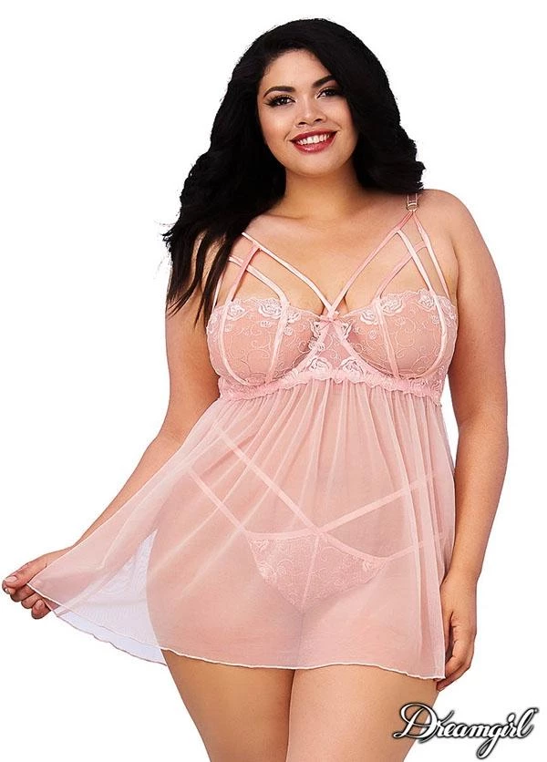 Whimsical stretch, shimmer mesh chemise with embroidered lace bra. Features include: Underwire, unlined cups, satin strappy details, adjustable shoulder and back straps. Matching strappy panty included. Plus is designed slightly different in bra area for better fit and support.