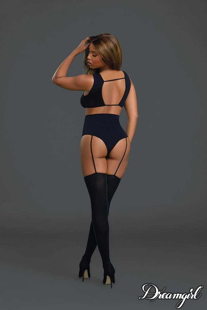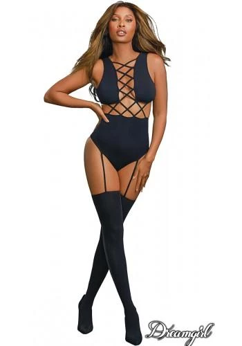 Gorgeous opaque seamless teddy body stocking with Neckline criss-cross details, thong back with snap crotch, attached elastic garters and matching thigh high stockings.