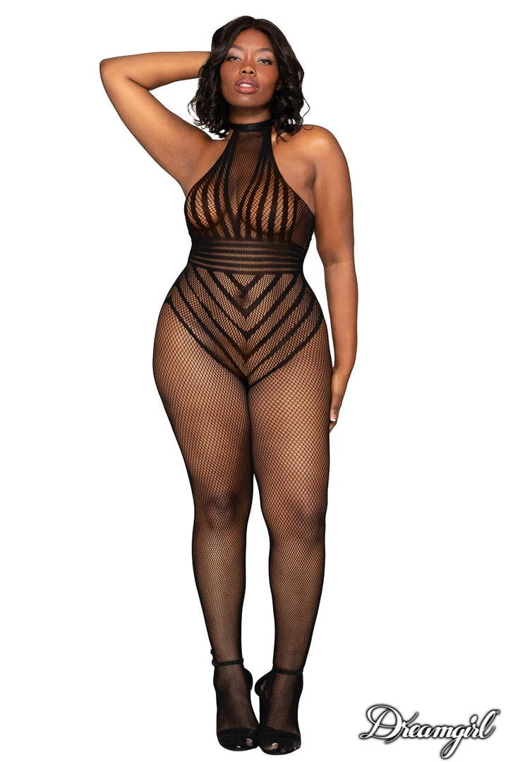 Fishnet bodystocking with a striped pattern along the front and back mimicking a teddy, a high halter neckline ending in a T-back, and an open crotch design (G-String not included)