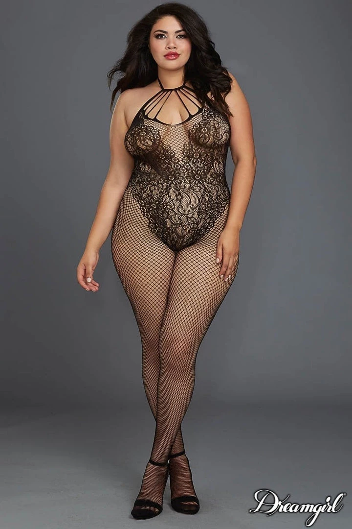 Fishnet bodystocking with a delicate lace pattern along the front and back mimicking a teddy, a strappy adjustable halter neckline and an open crotch.