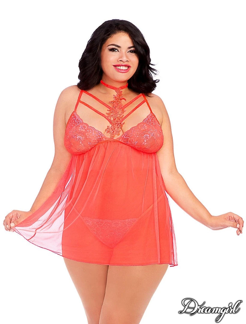 Sheer stretch mesh babydoll with a ruched full skirt, a strappy, cage-like elastic high neck featuring embroidered venice lace flowers and a tie-neck closure, adjustable straps, soft unlined lace cups with an elastic underbust, and a hook & eye back closure. (Matching G-string included)