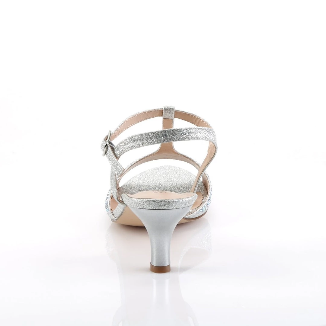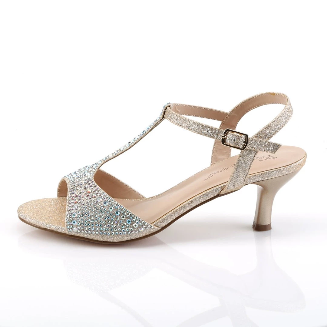 A Kitten Heel T-Strap Sandal Embellished with Multi Rhinestones, a peep toe, an adjustable ankle strap, and a rubber bottom. This rhinestone covered peep toe pump features a 2 1/2 inch heel and an eye-catching t-strap with an adjustable strap.