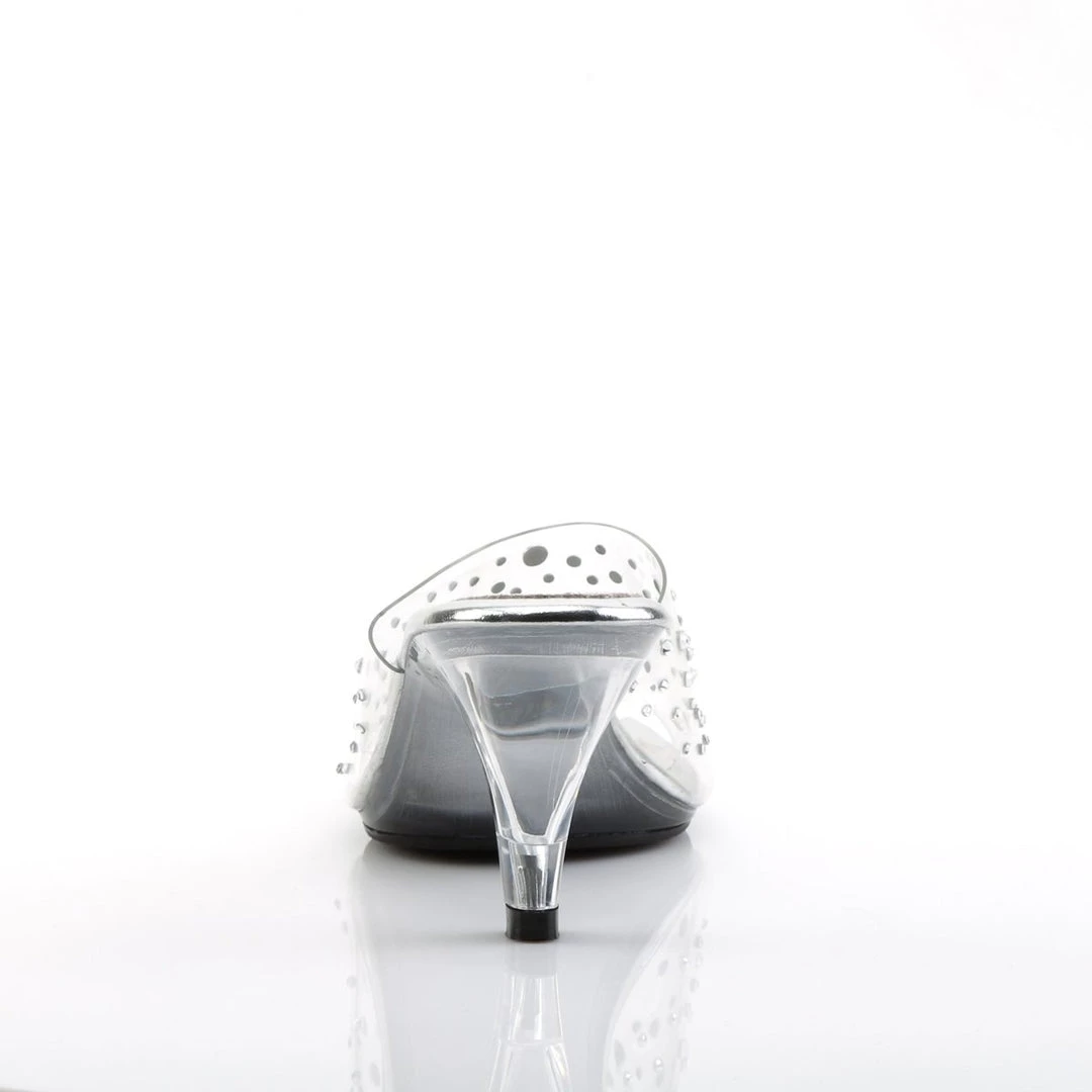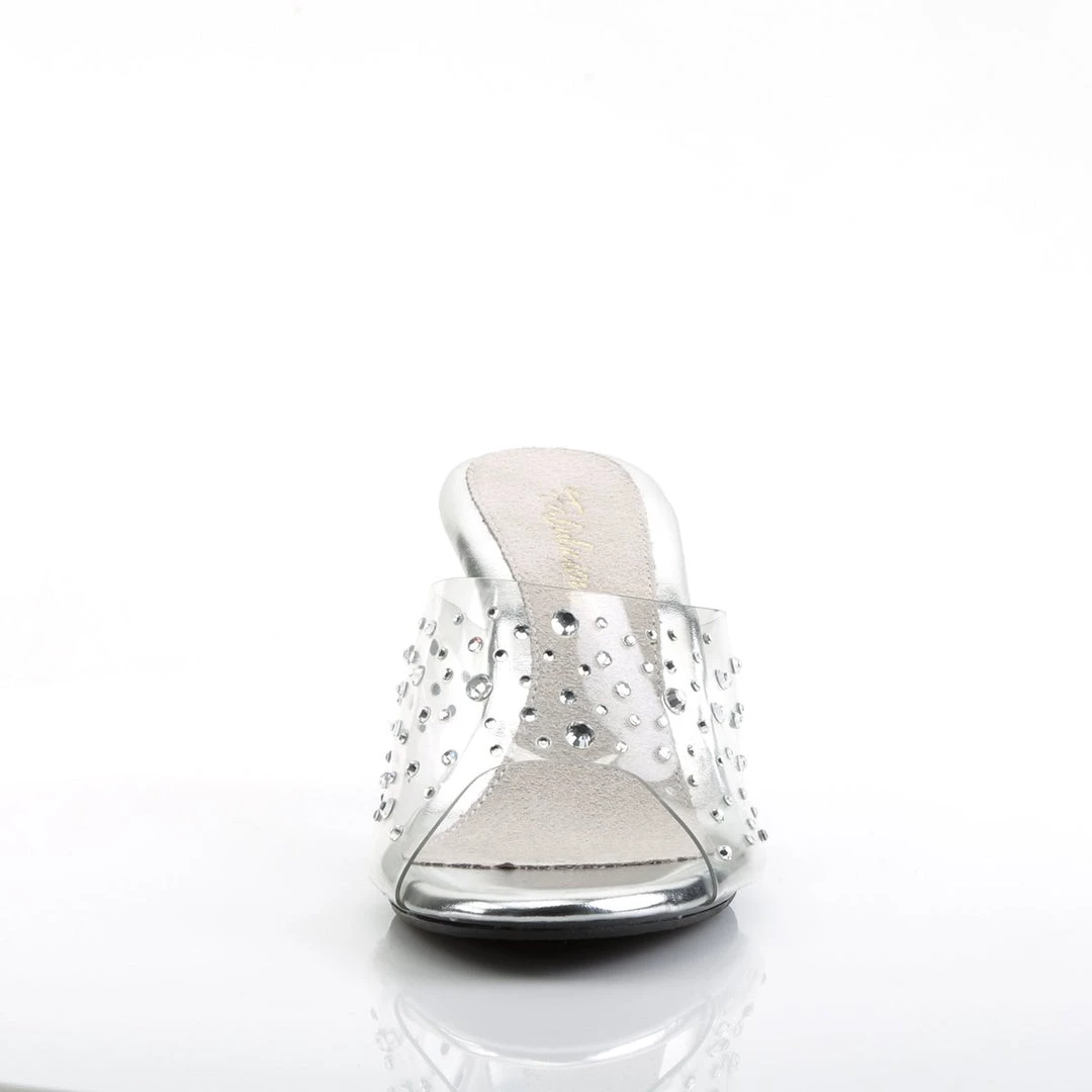 Fabulous mules with crystal adorned clear top which leaves the foot exposed, open toe with square cut design and white padded sole for added comfort. The delicate 3 inch (7.5 cm) high heels are made in clear material for an uniform look and a chic appearance. Comfortable and sparkly, these mules are a must have for any fashionista!
