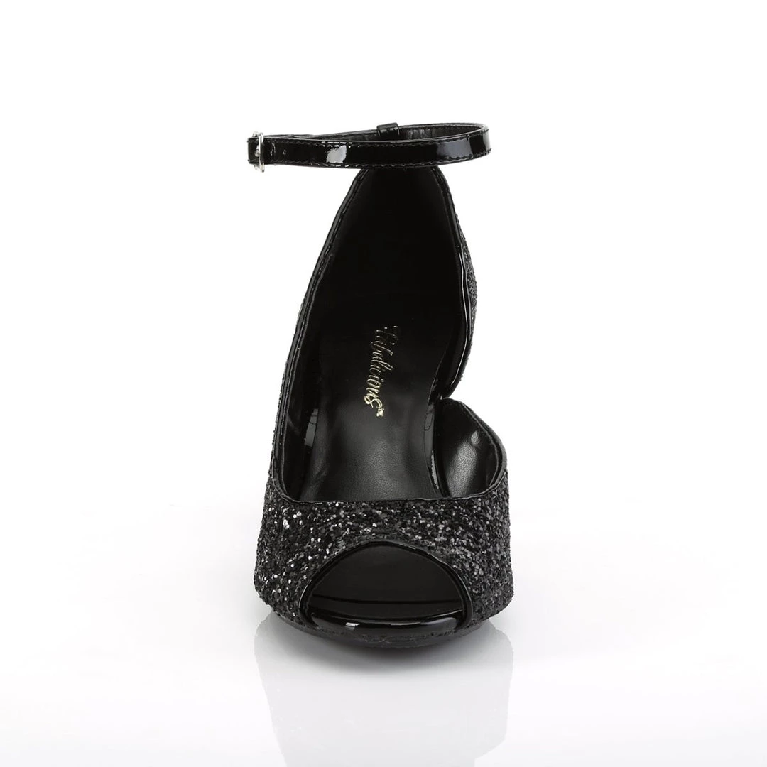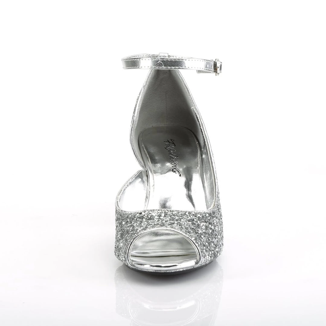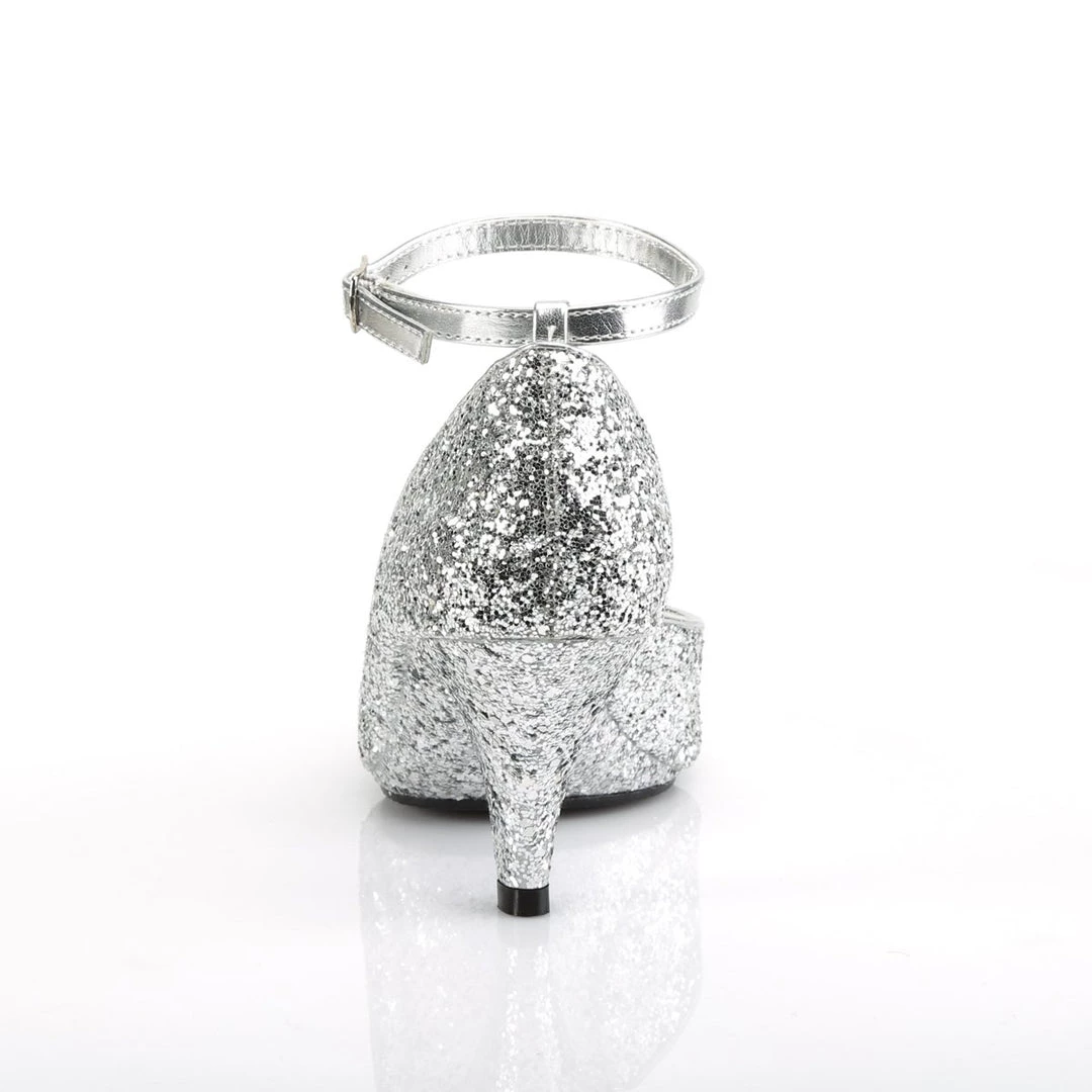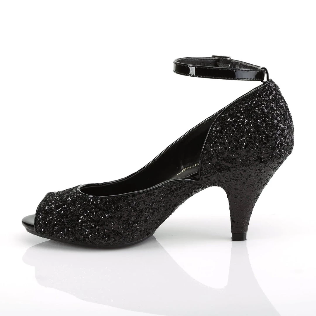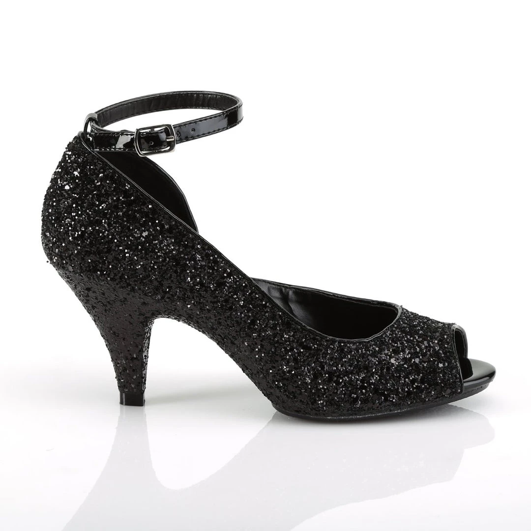 Put a little sparkle in your step with these 3″ (7.6cm) heel, 1/8″ (0.3cm) platform peep toe ankle strap pump with an asymmetrical topline.