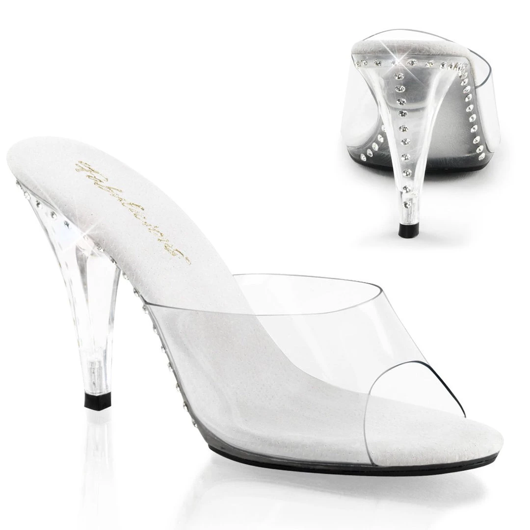 Clear slide sandal with black insole features a single line of rhinestones adorning the 4″ heel and bottom. FABULICIOUS shoes will compliment a wearer’s natural beauty and allow her to exude confidence.