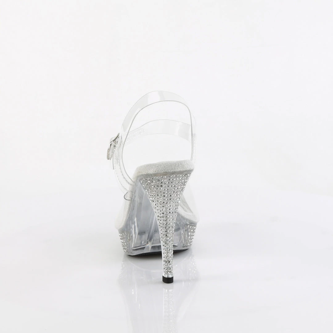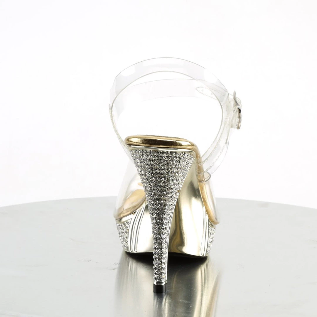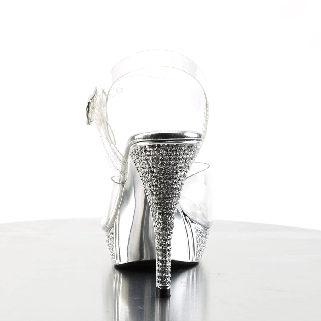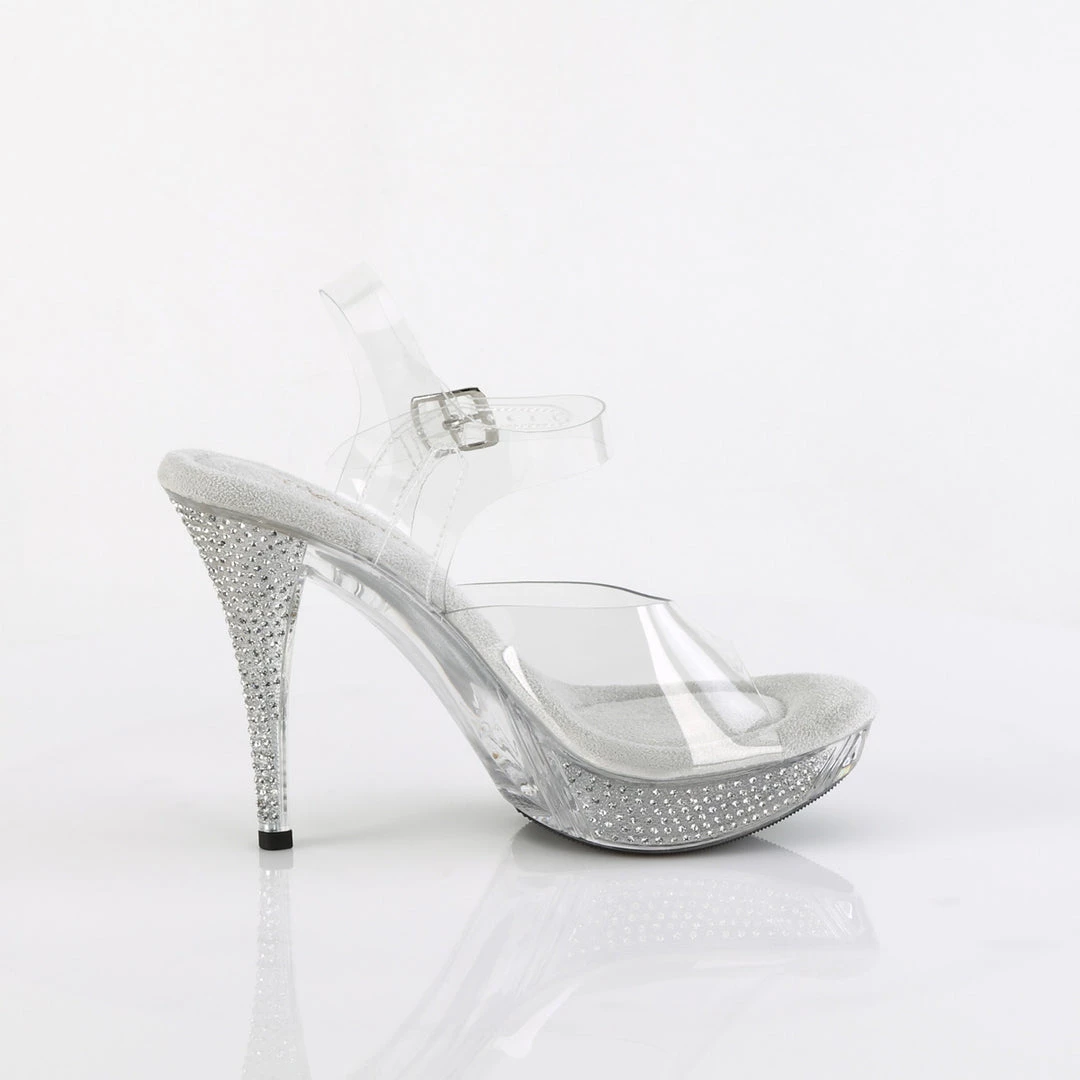 Play with transparency for a provocative look. These all clear sandals will help you achieve a sexy look, without sacrificing your comfort. They feature wide toe strap, two side straps which support an ankle strap with metallic buckle side closing, clear 4.5 inch high heels and front chrome platform with 1 inch height both adorned with crystals.