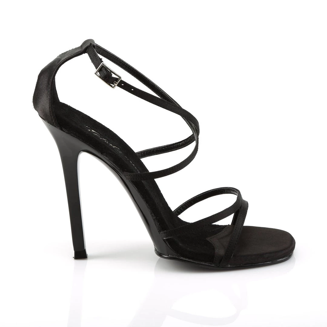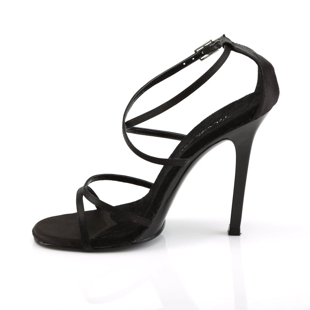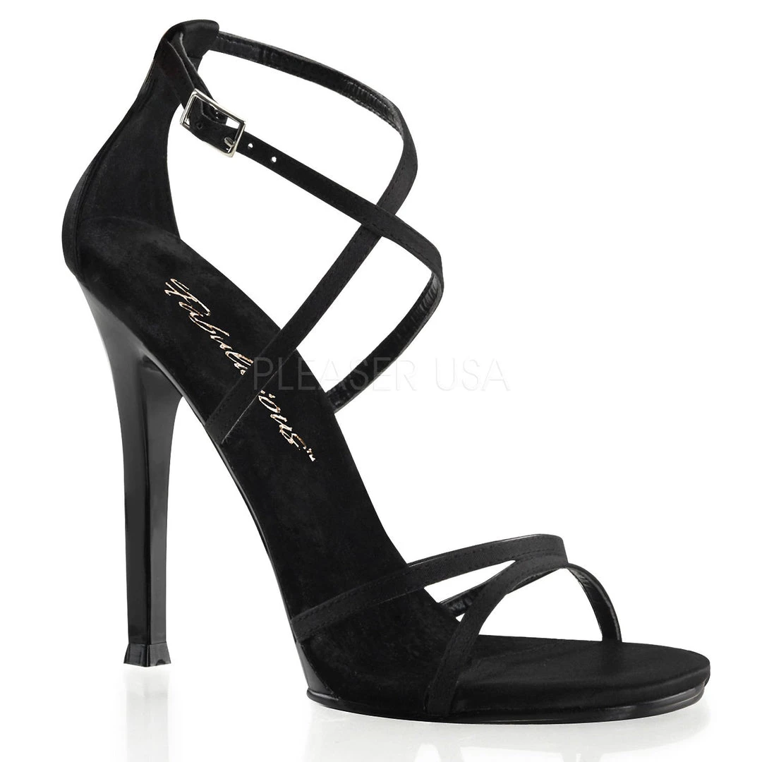 Black sandals with criss-cross pattern on the instep, double toe straps which fusion in the middle, back strap which supports the ankle strap and a dazzling 4.5 inch (11.5 cm) high stiletto heels which create a dramatic look. The metallic buckle on side gives the possibility to adjust the size for a perfect fit, while the soft cushioning adds further comfort.