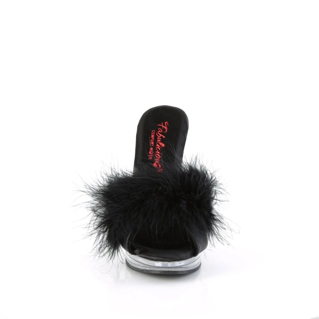 Whimsical & fun 5″ (123mm) heel, 3/4″ (16mm) platform comfort width Marabou slipper.