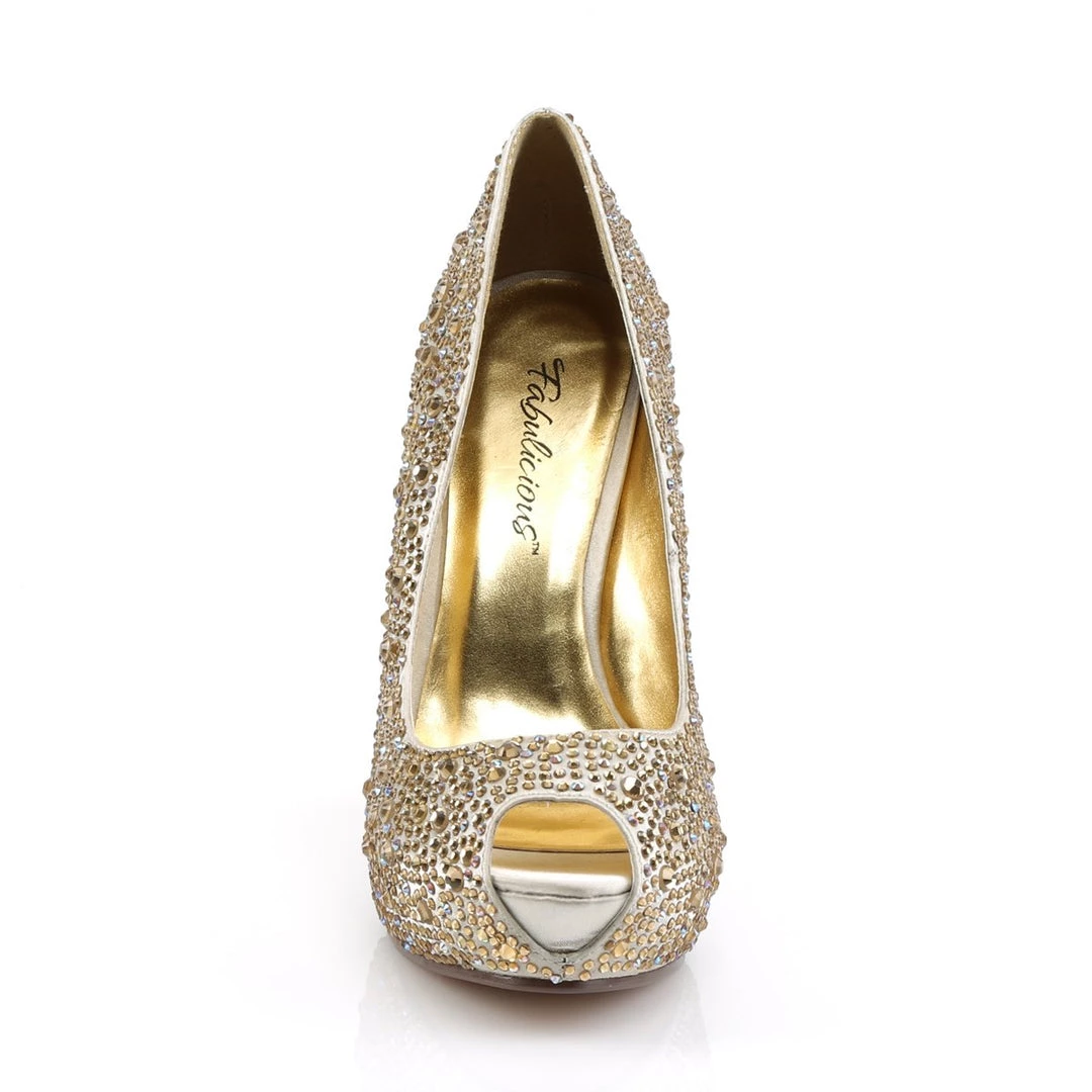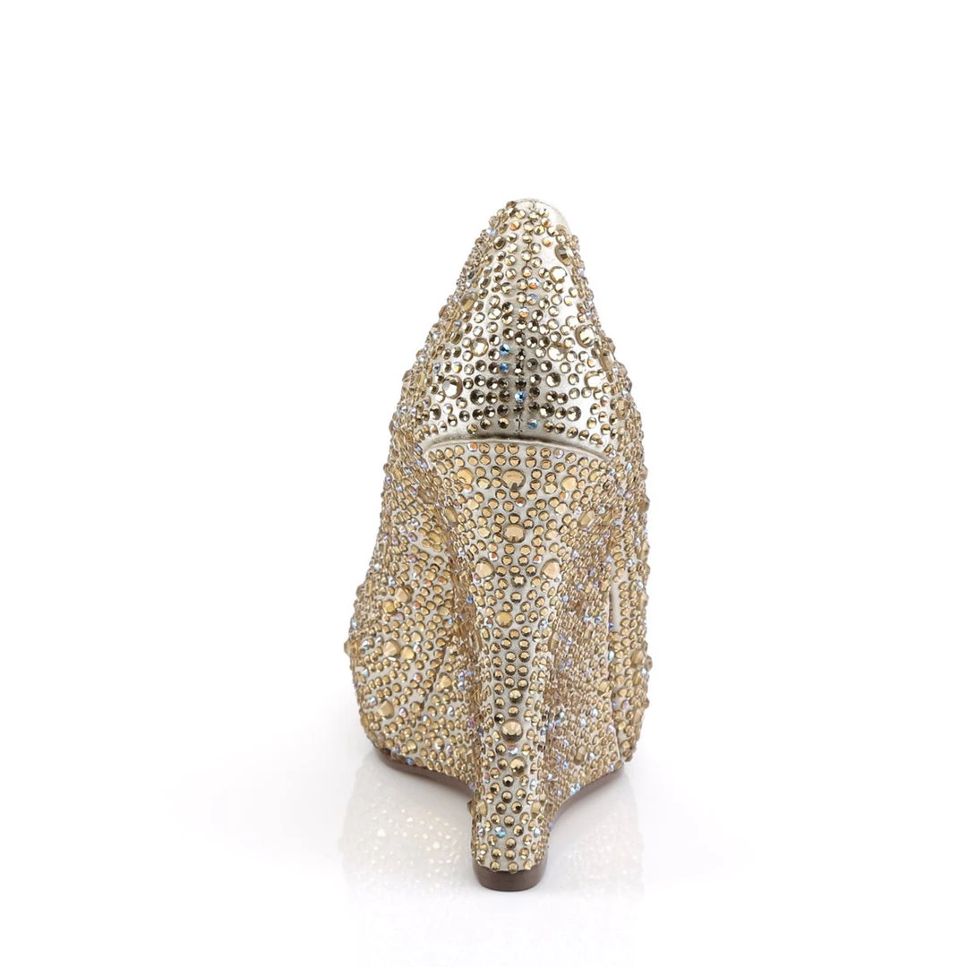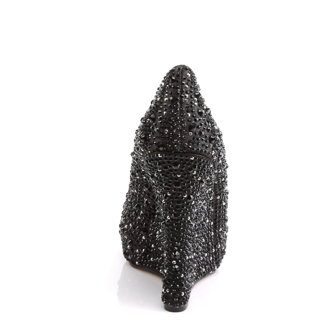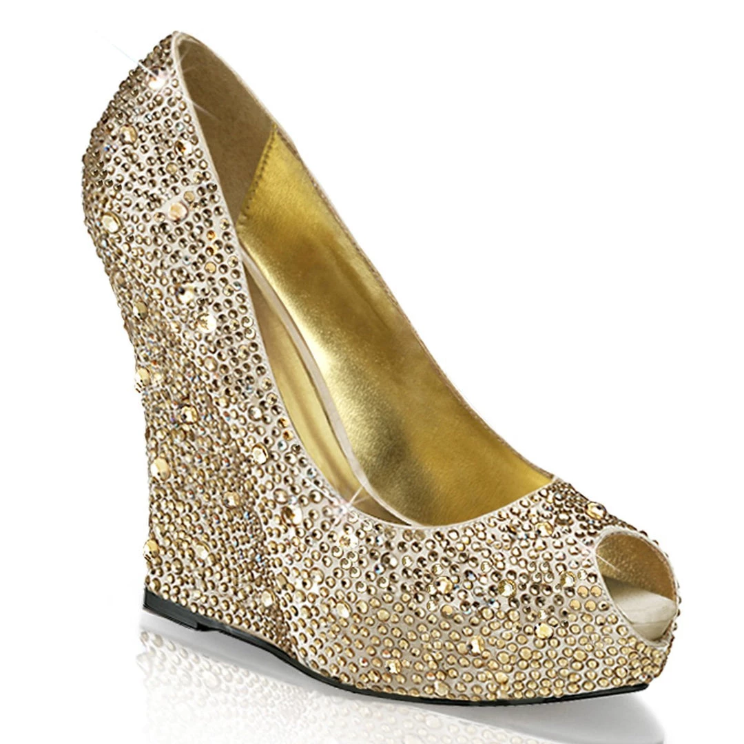 Be the center of attention with this sexy and classic 5 1/4″ (13.5 cm) wedge, 1 1/4″ (3 cm) hidden platform peep toe pump w/ multi sized rhinestone embellishments.