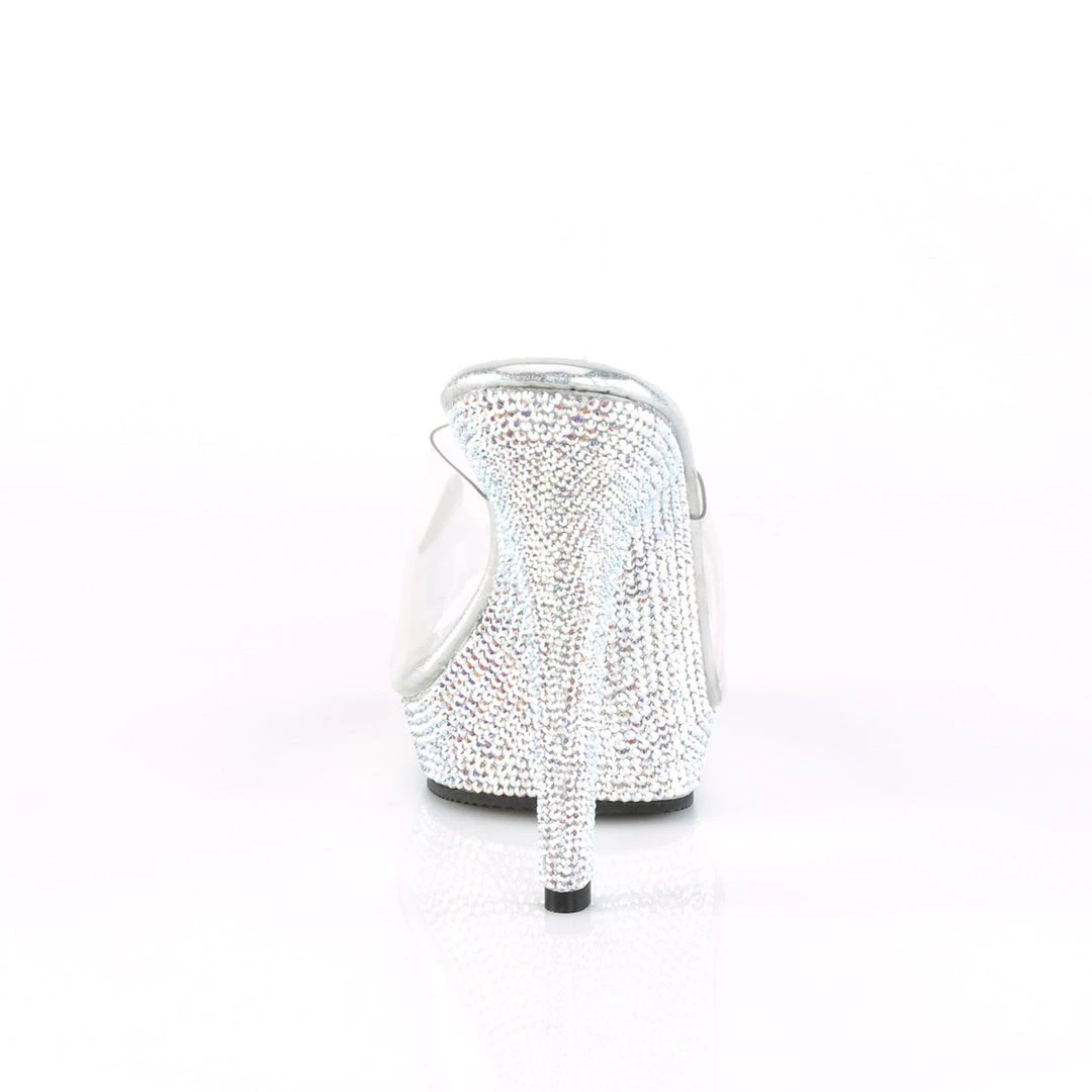 A high-stepping, ultra-sexy look comes from Pleaser’s Lip slide. All clear mules with 5 inch (12.5 cm) high stiletto heels and 0.75 inch (2 cm) front platform. Adorned with crystals on platform and heels. Its padded, sueded footbed helps keep you comfy all the while.