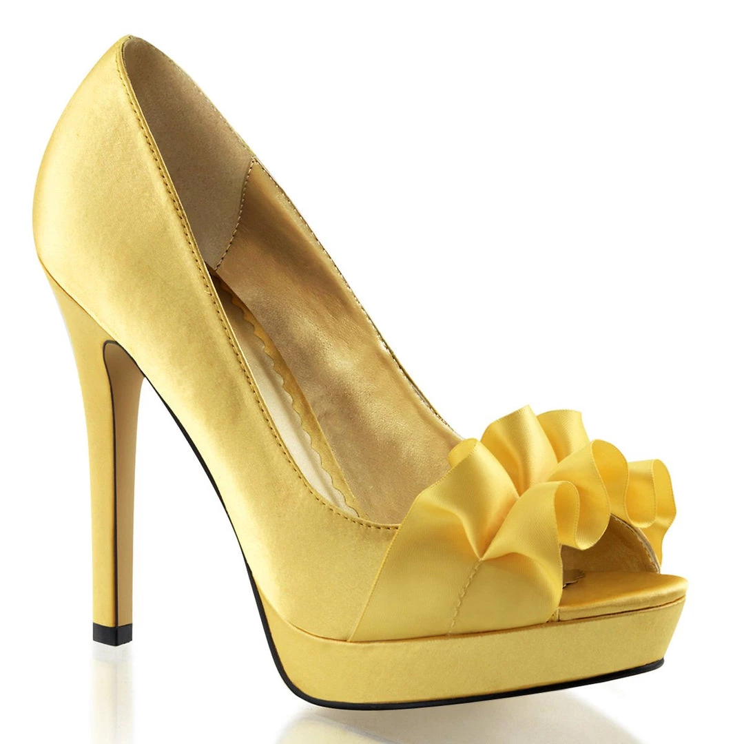 Platform Peep Toe Pump Frilled with Tonal Pleated Ribbon Across the Vamp. The 4.75 inch heels add up further elegance to these stylish sandals, while the mini platform completes the design and adds stability.