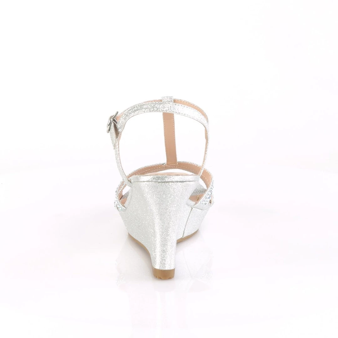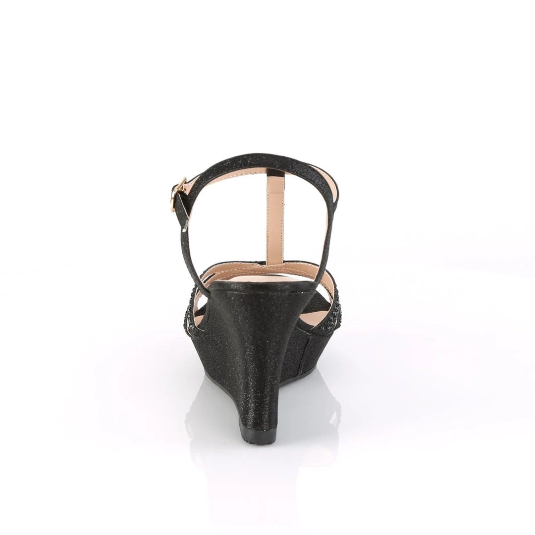 Sparkle in these gorgeous 3″ (80mm) heel, 1/4″ (6mm) platform T-strap wedge sandal with rhinestones on vamp.