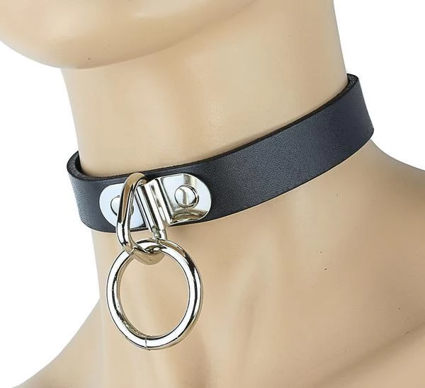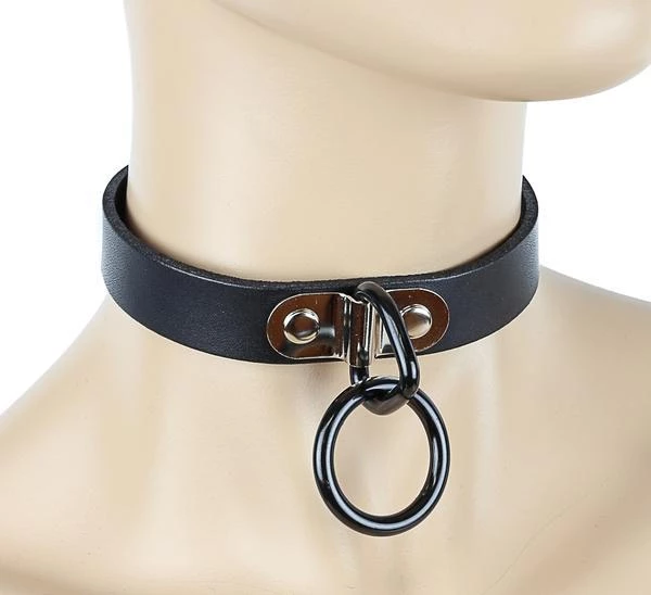 Strong and sexy in this 3/4″ black leather choker with one 1″ loop & ring.