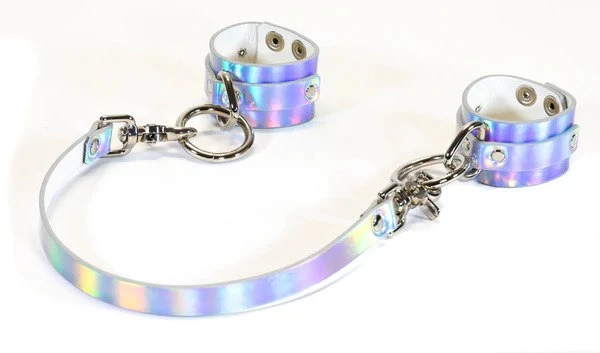 Rainbow handcuff with a leather leash.
