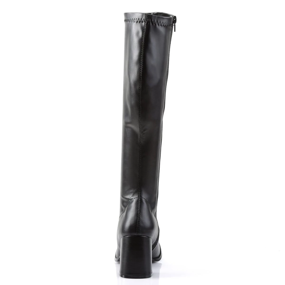This knee-high style is made of shiny patent in a form-fitting shape with a mod, sixties design that’ll keep his eyes glued on you. The retro inspired GOGO-300 knee high boot features a 3″ block heel, stretch faux patent or faux leather uppers and a side zipper. These boots will be the perfect compliment to you Gogo Dancer costume!
