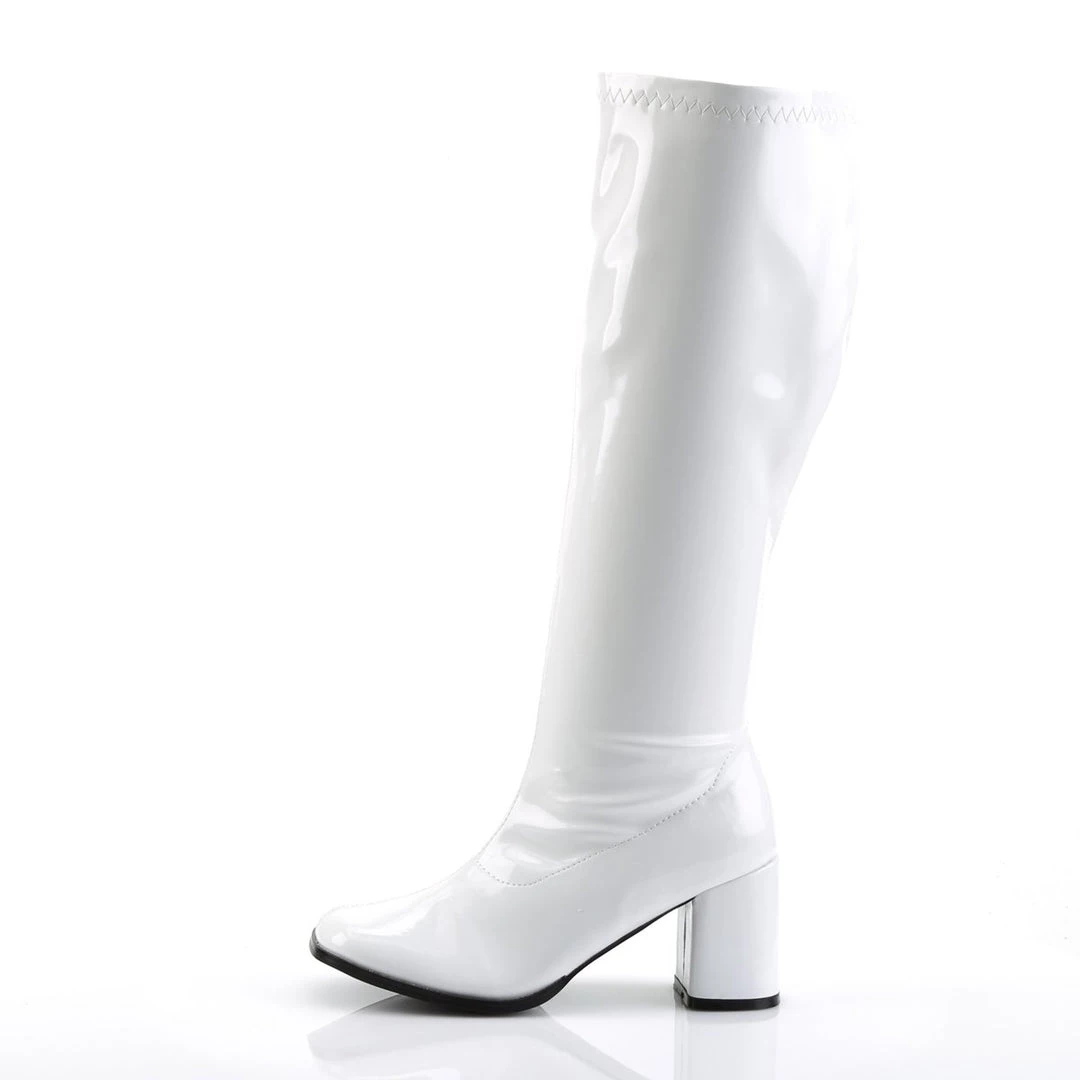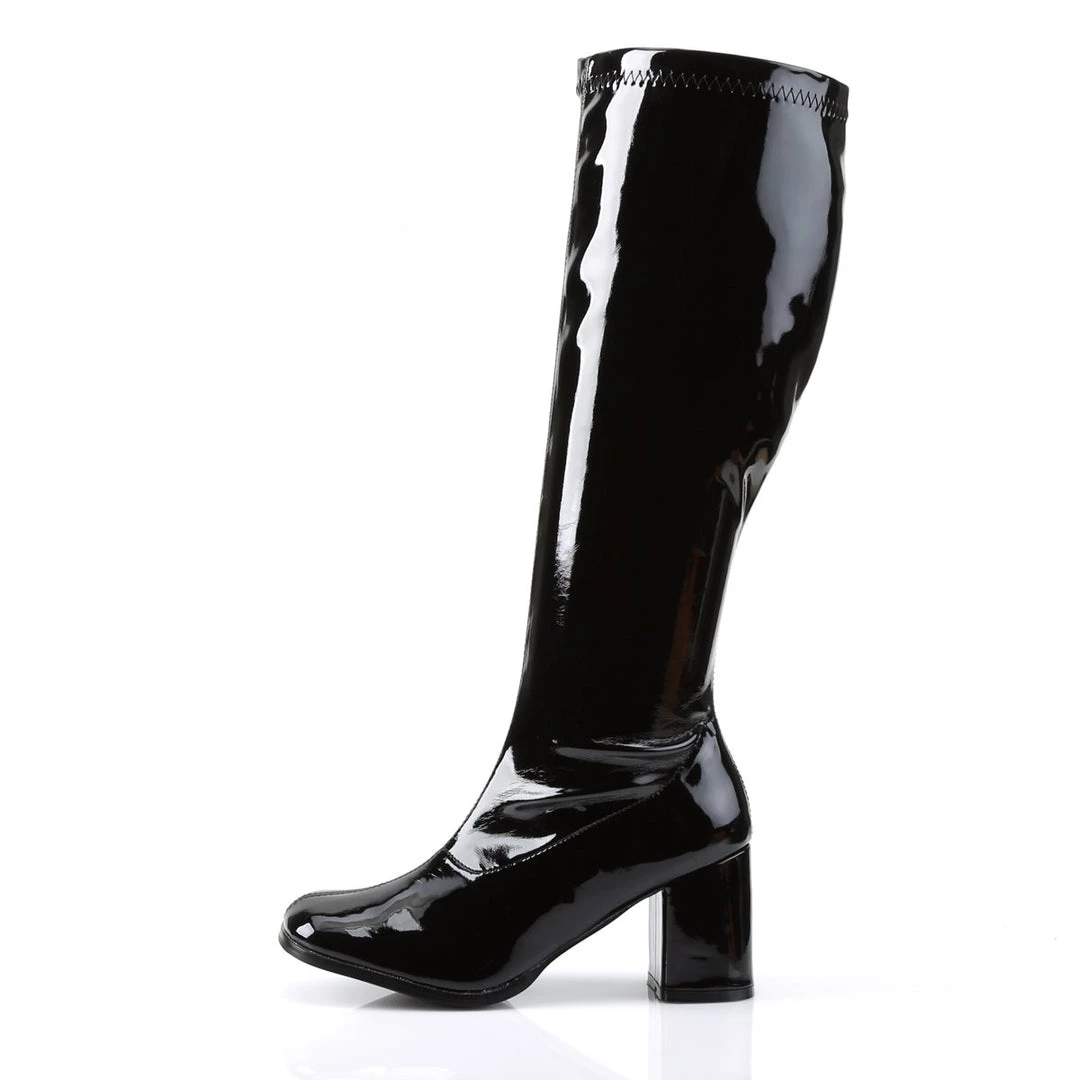 This sexy boot is constructed with flexible synthetic man made uppers and features a square toe, lightly padded insole, side zip, and a man made rubber sole with a sturdy square heel. Pair this stunning boot with a knee-high skirt for a look that kills. Stretch Pu or Stretch faux patent upper and side zipper. 3″ Block Heel Wide Calf Stretch Boot. These boots will be the perfect compliment to your Gogo Dancer costume.