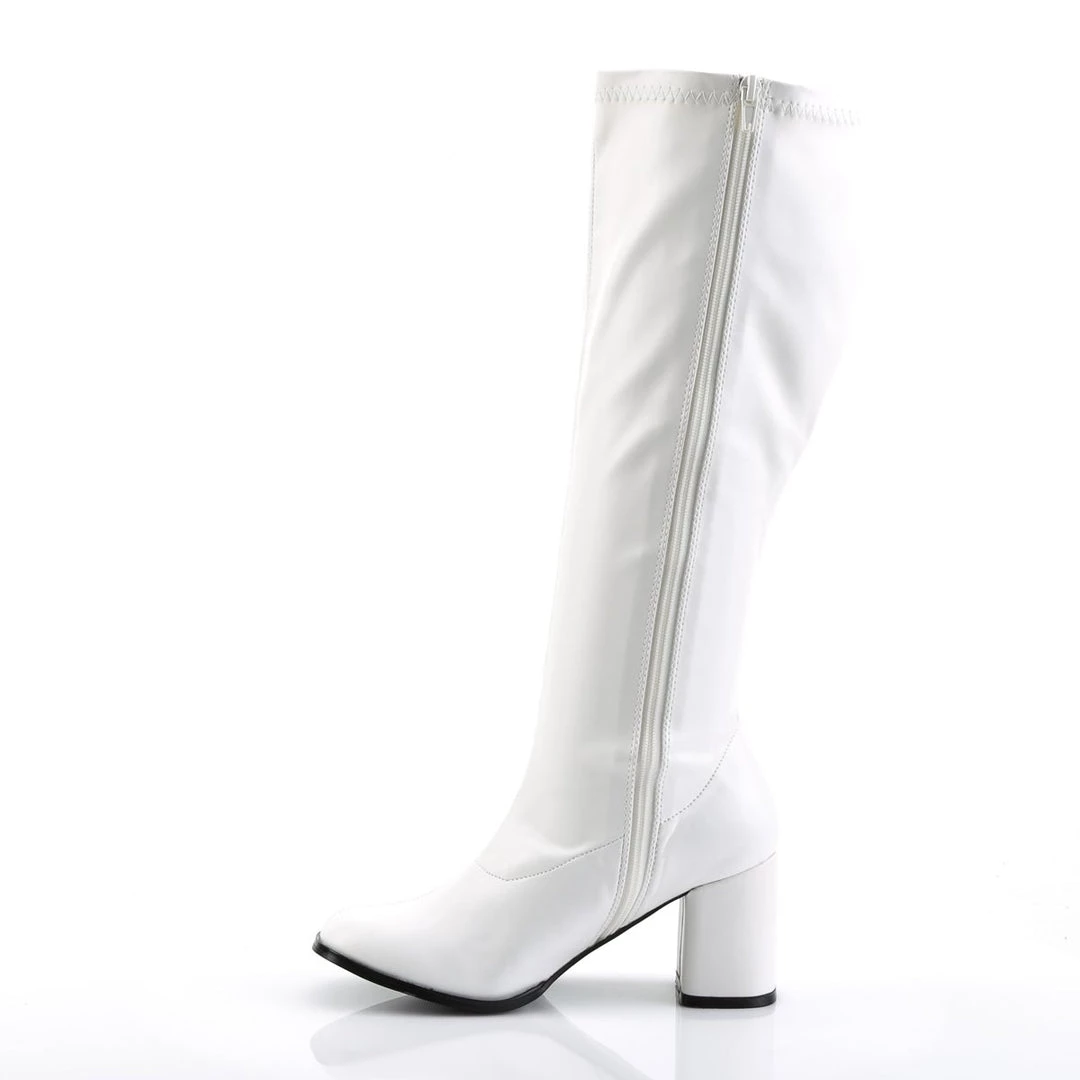 This sexy boot is constructed with flexible synthetic man made uppers and features a square toe, lightly padded insole, side zip, and a man made rubber sole with a sturdy square heel. Pair this stunning boot with a knee-high skirt for a look that kills. Stretch Pu or Stretch faux patent upper and side zipper. 3″ Block Heel Wide Calf Stretch Boot. These boots will be the perfect compliment to your Gogo Dancer costume.