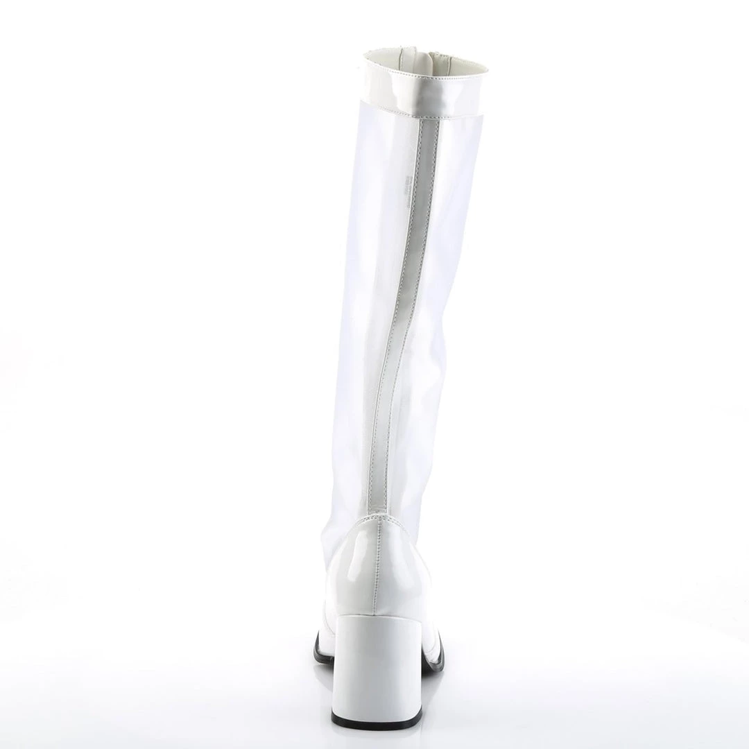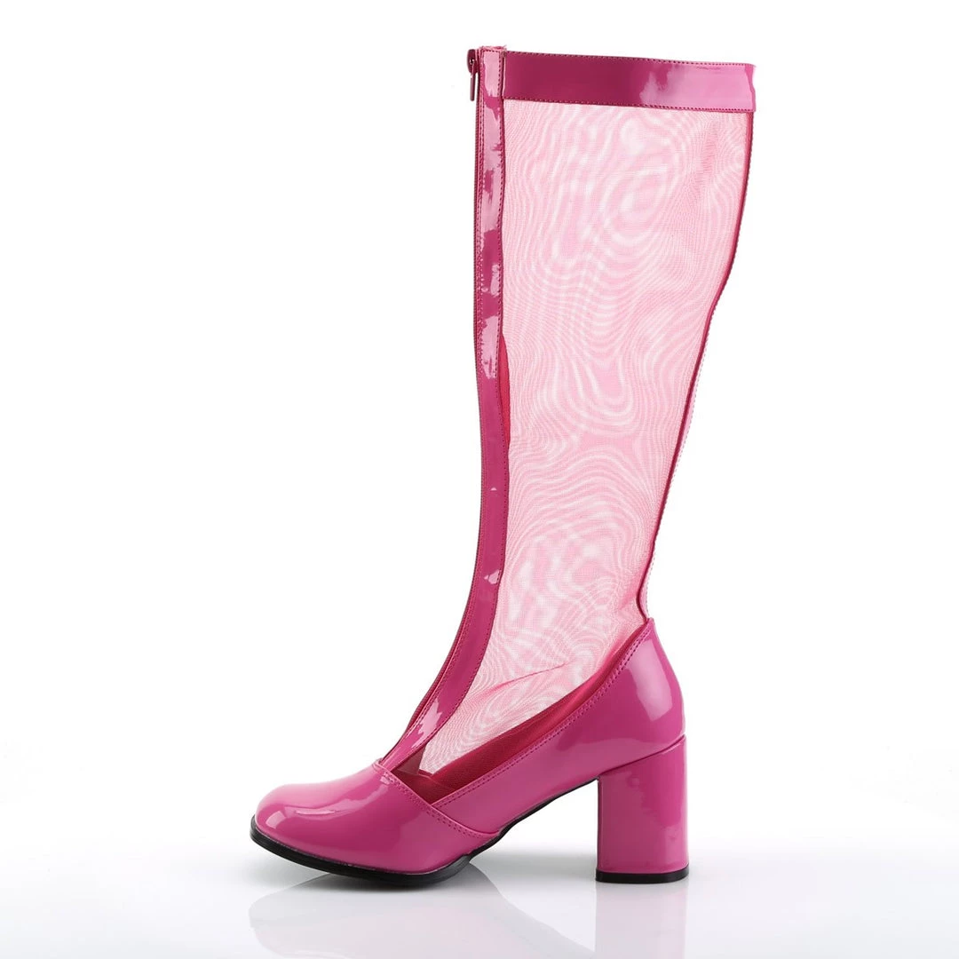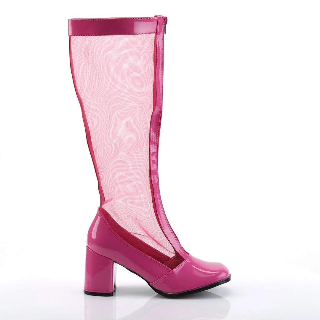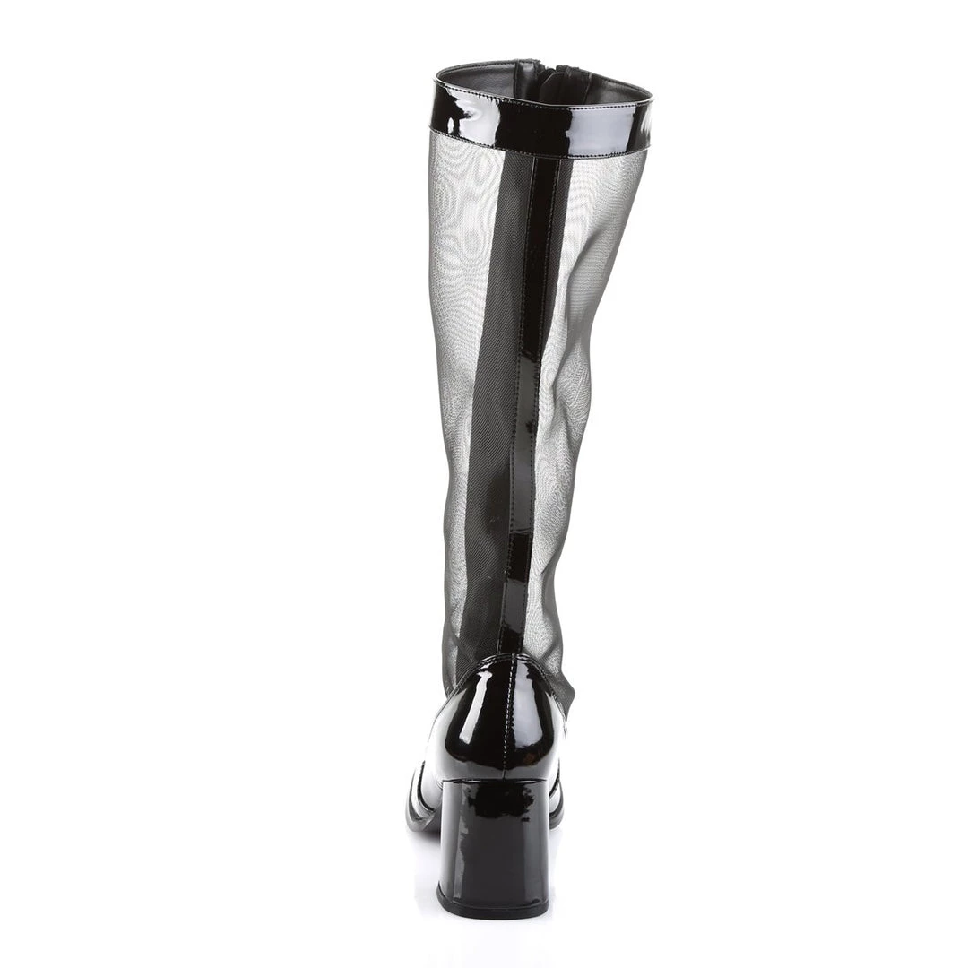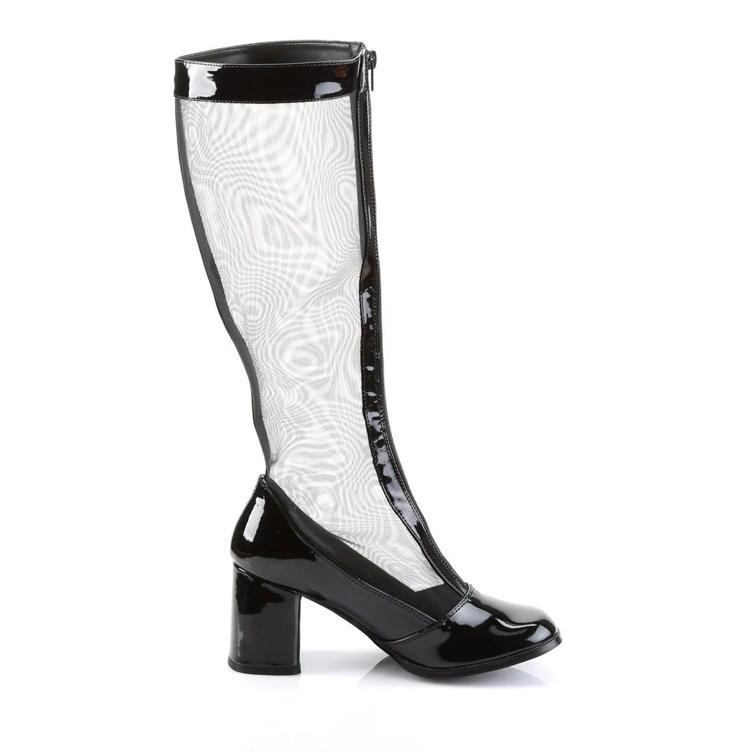 Make your fashion with this knee boots featuring 3″(7.50cm) Block Heel Gogo Mesh Boot, Stretch Patent, Front Zip Closure