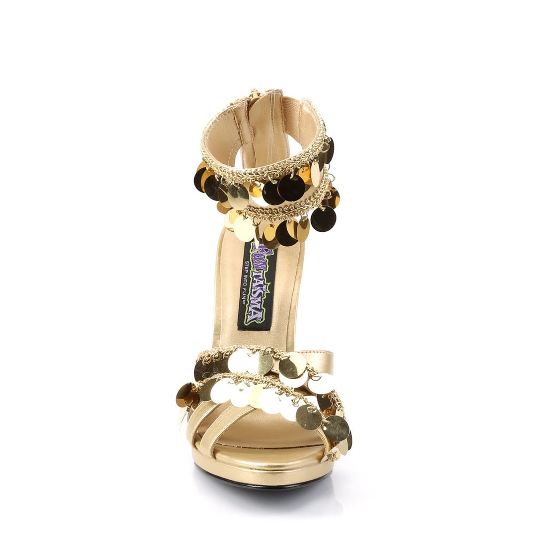 A stylish sign of the times, this shimmery, collared platform sandal from Funtasma is dripping not with gold but with gold-tone penny charms for a very festive, albeit thrifty, design! The Gypsy is crafted with a metallic leather-look upper and features a zipper up the back for easy on and off and elastic goring at the collar for added comfort. Pair with the season’s flowy boho skirt to complete this trendy look.