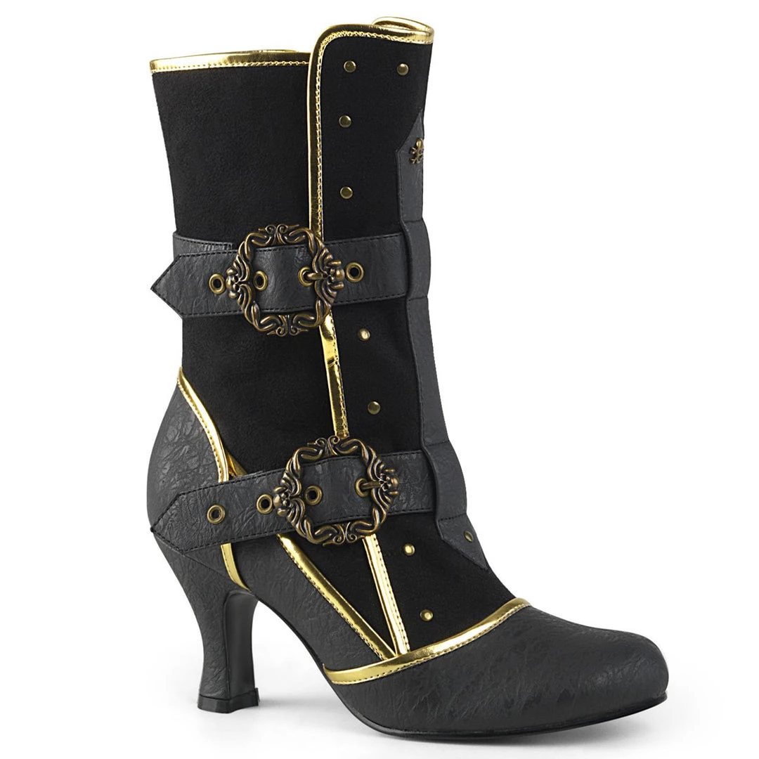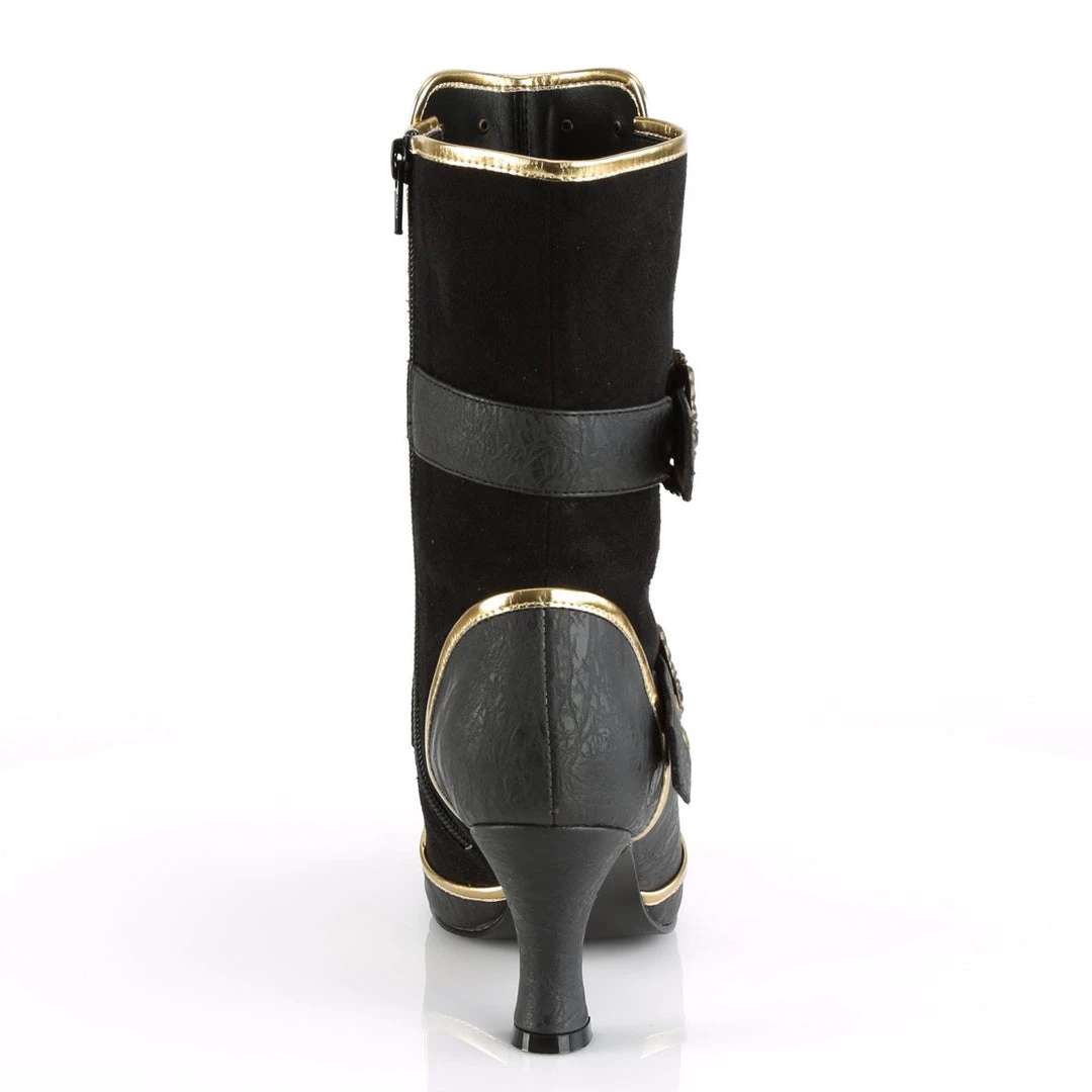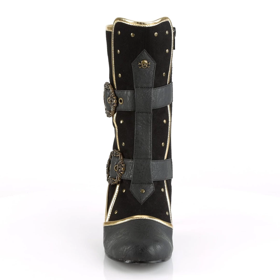 Channel your inner pirate in these 3″ (75mm) heel round toe ankle boots, featuring gold trims, adjustable octopus buckle straps, flat studs and front center skull & crossbones stud details and inside zip closure.
