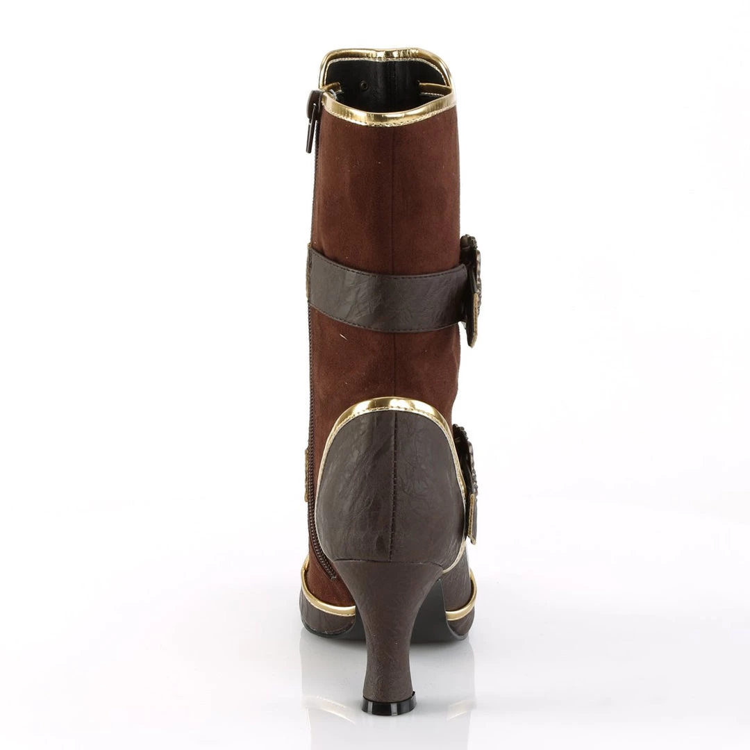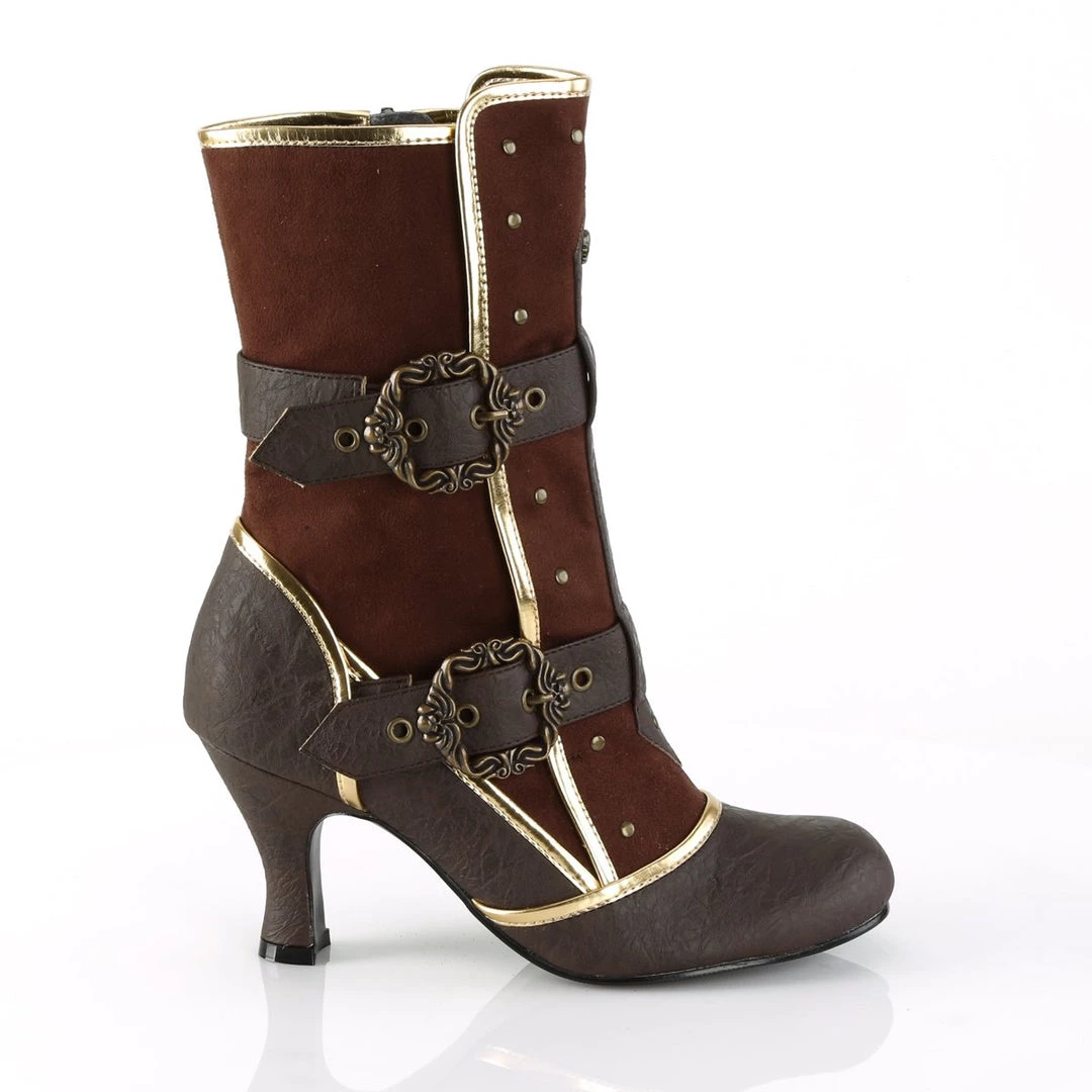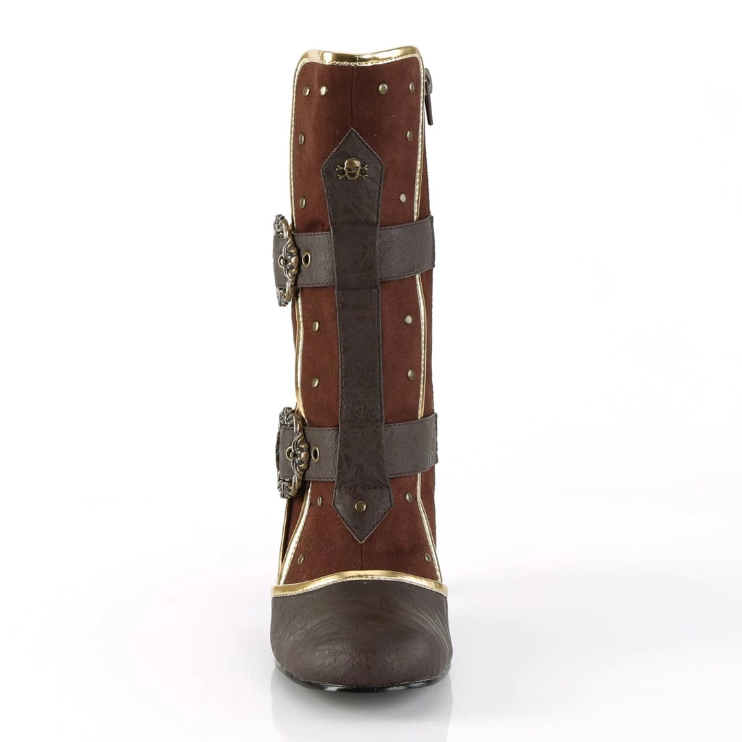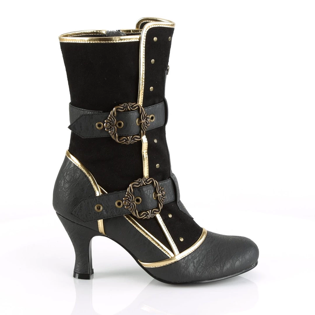 Channel your inner pirate in these 3″ (75mm) heel round toe ankle boots, featuring gold trims, adjustable octopus buckle straps, flat studs and front center skull & crossbones stud details and inside zip closure.