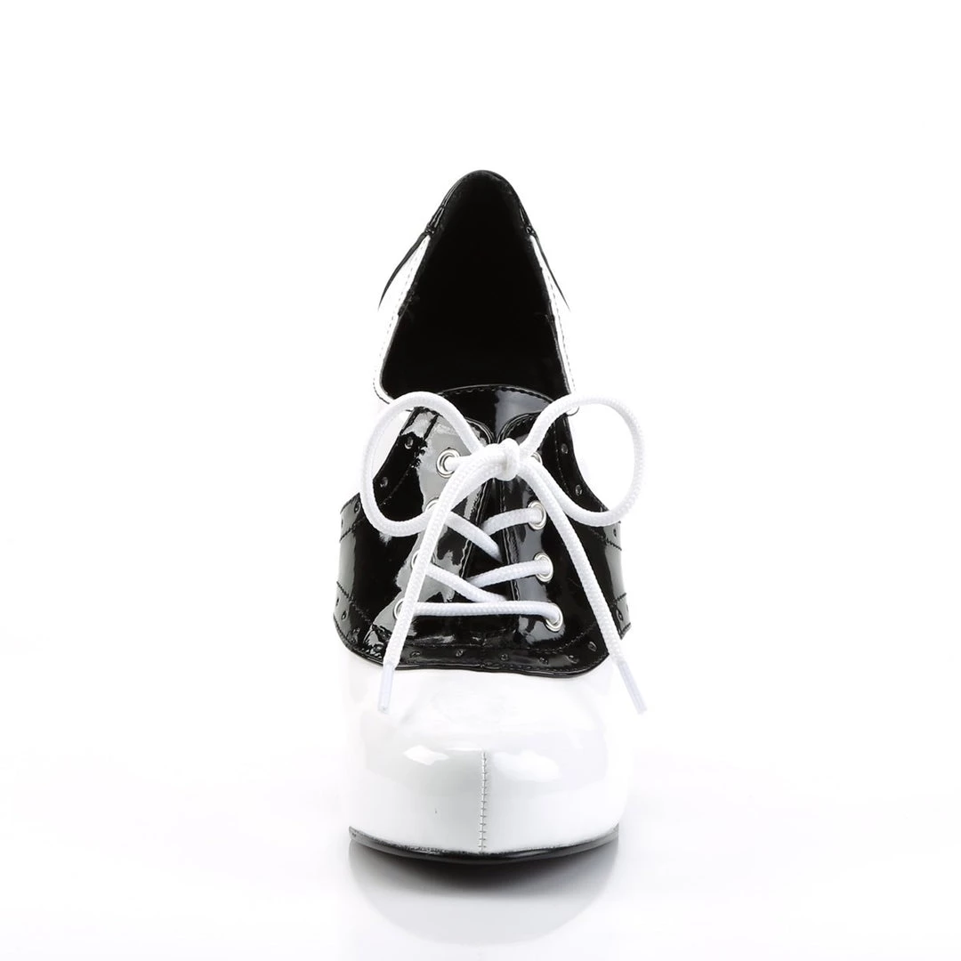 Retro Shoes – Classic Black & White 1950’s Retro Rockabilly Oxford Saddle Shoes with 4 1/2 inch Heel and 3/4 hidden platform. Two-tone patent leather in a lace-up oxford style make up these pumps from Funtasma. These heels look great paired with a costume or with your everyday attire.