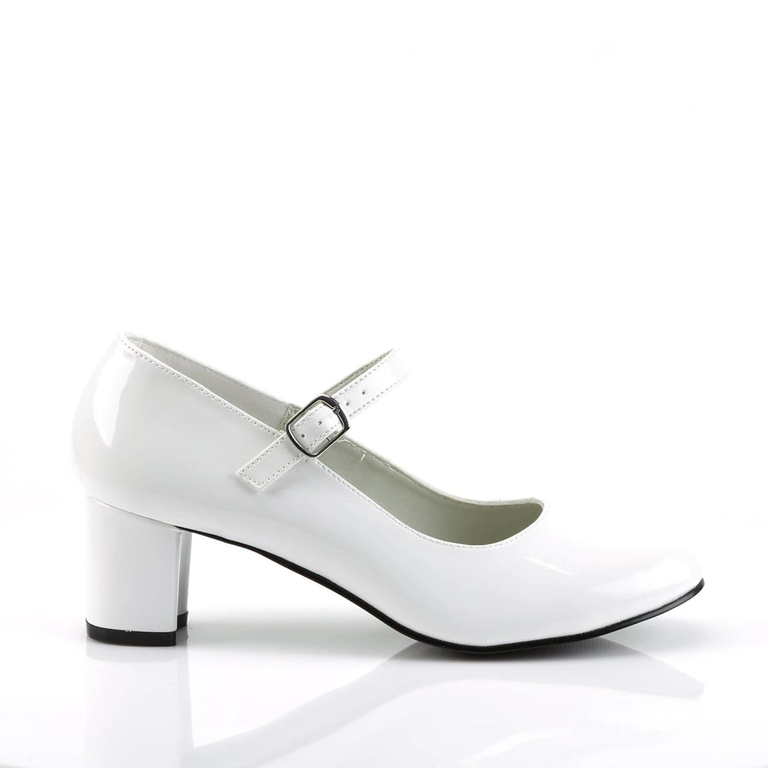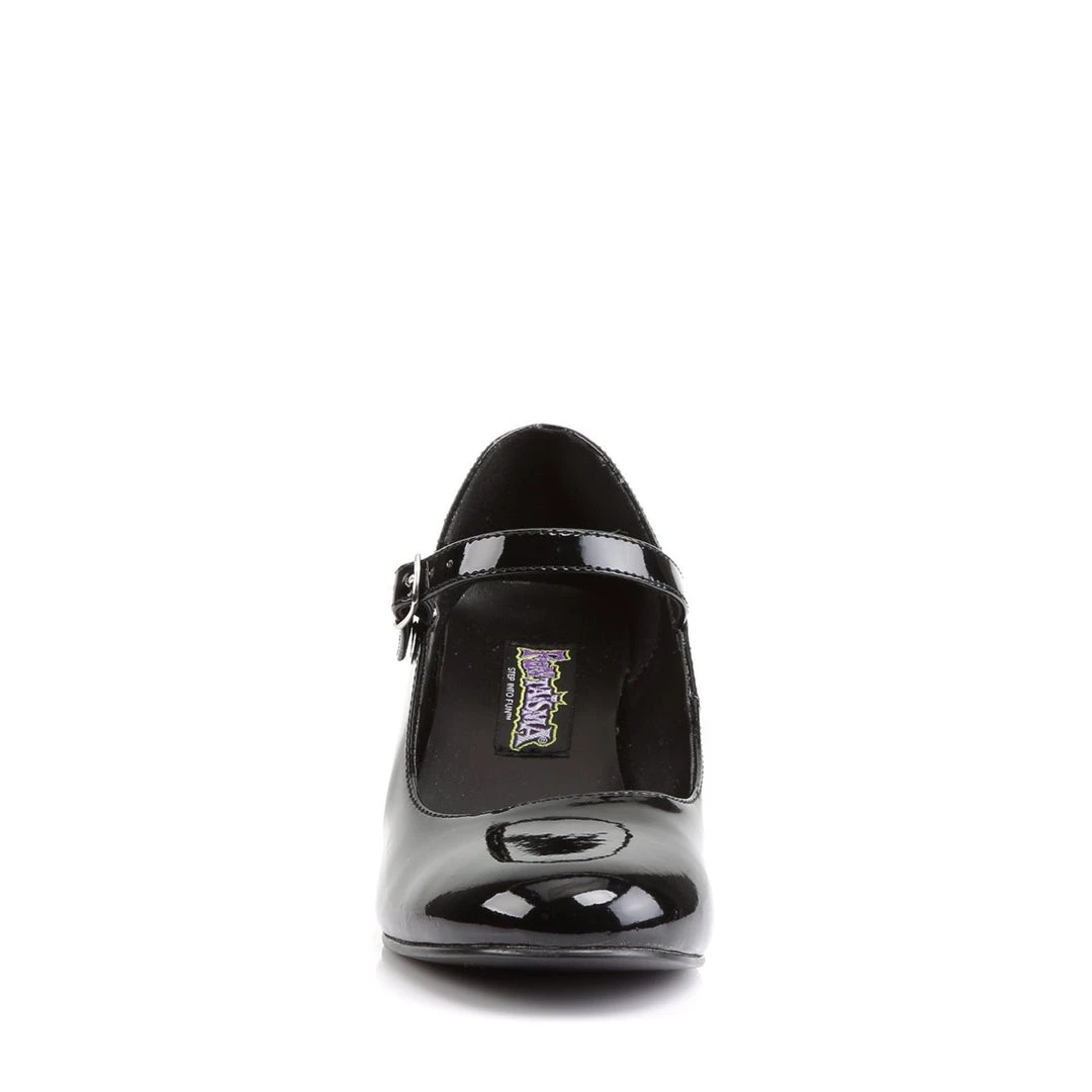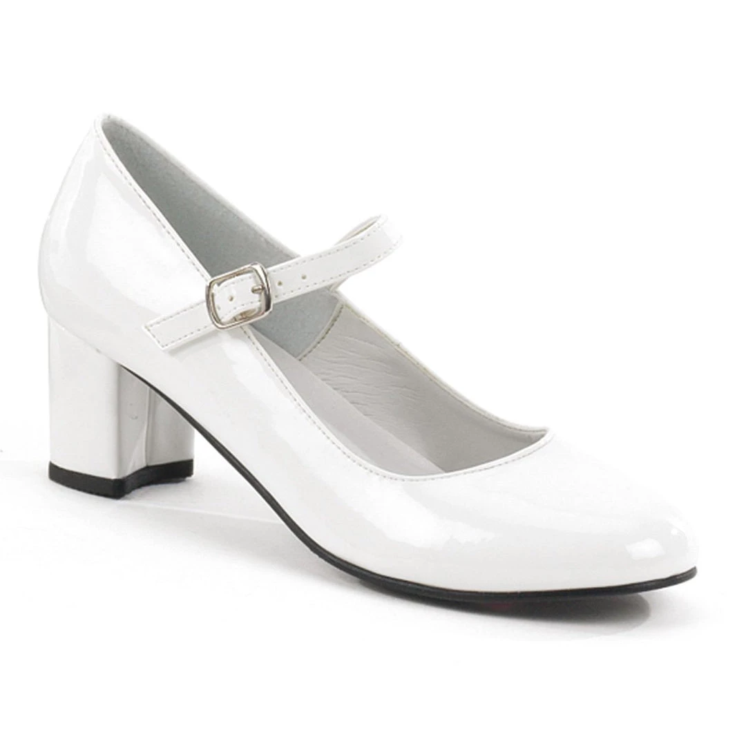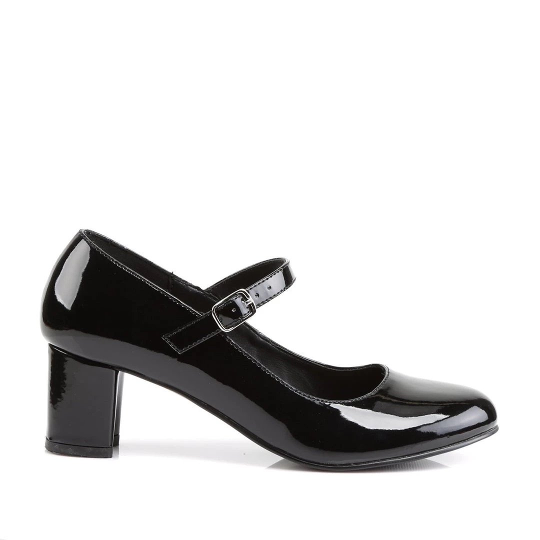 This classic and cool shoe features a rounded toe and a slender strap at the vamp that buckles for a good fit. A chunky high heel gives the look a lift, and a glossy finish adds allure. 2 Inch Heel Single Strap Pump.
