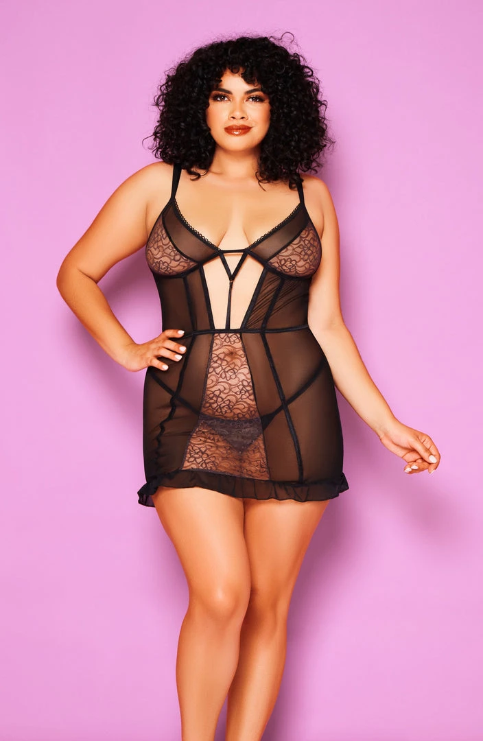 Looking extra glowy in this cut-out strappy mesh and lace chemise with ruffle hem.