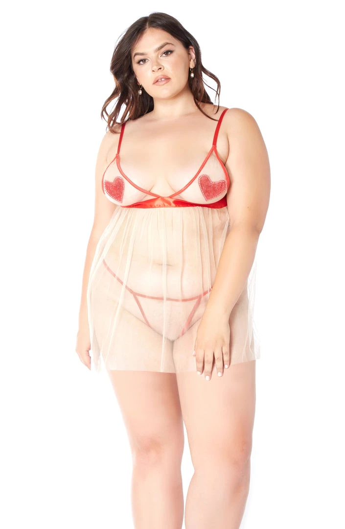 It’s the time of the year to spread love and positivity! Features heart applique soft cup mesh babydoll with satin ribbon tie flyaway back and matching g-string.