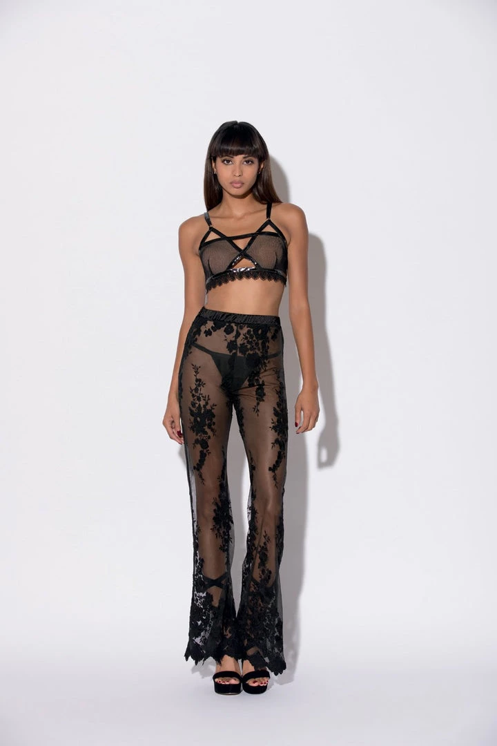Show your sensual side in these embroidery flared lace pants with keyhole on the side.
