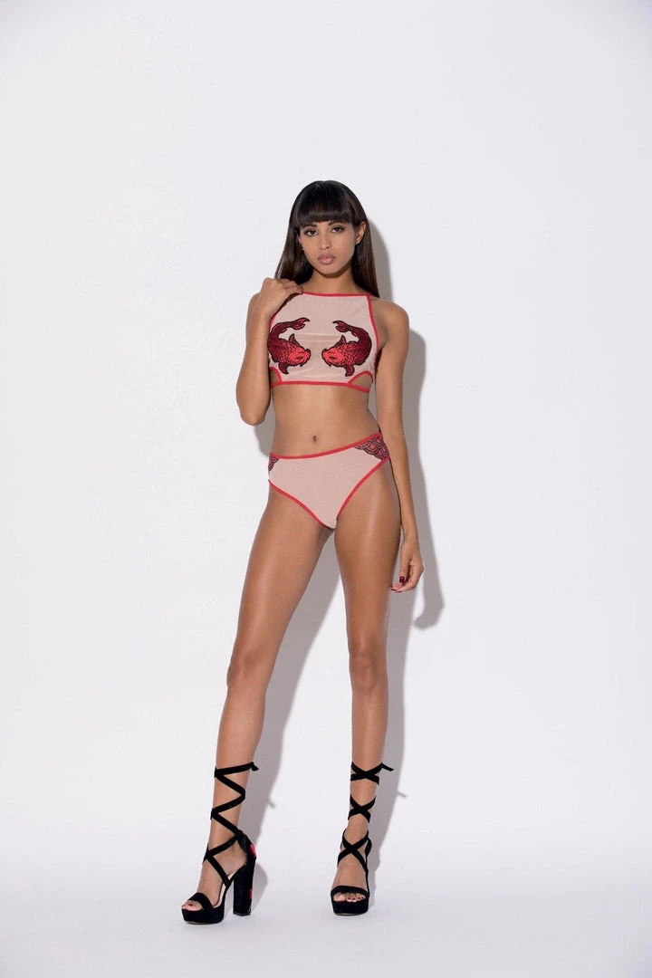 Fun koi fish applique bra with underbust cut out. Match with 2028-P.