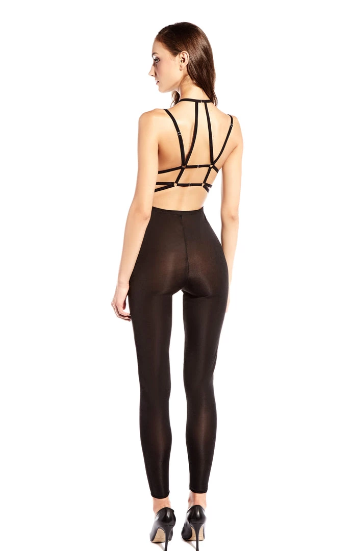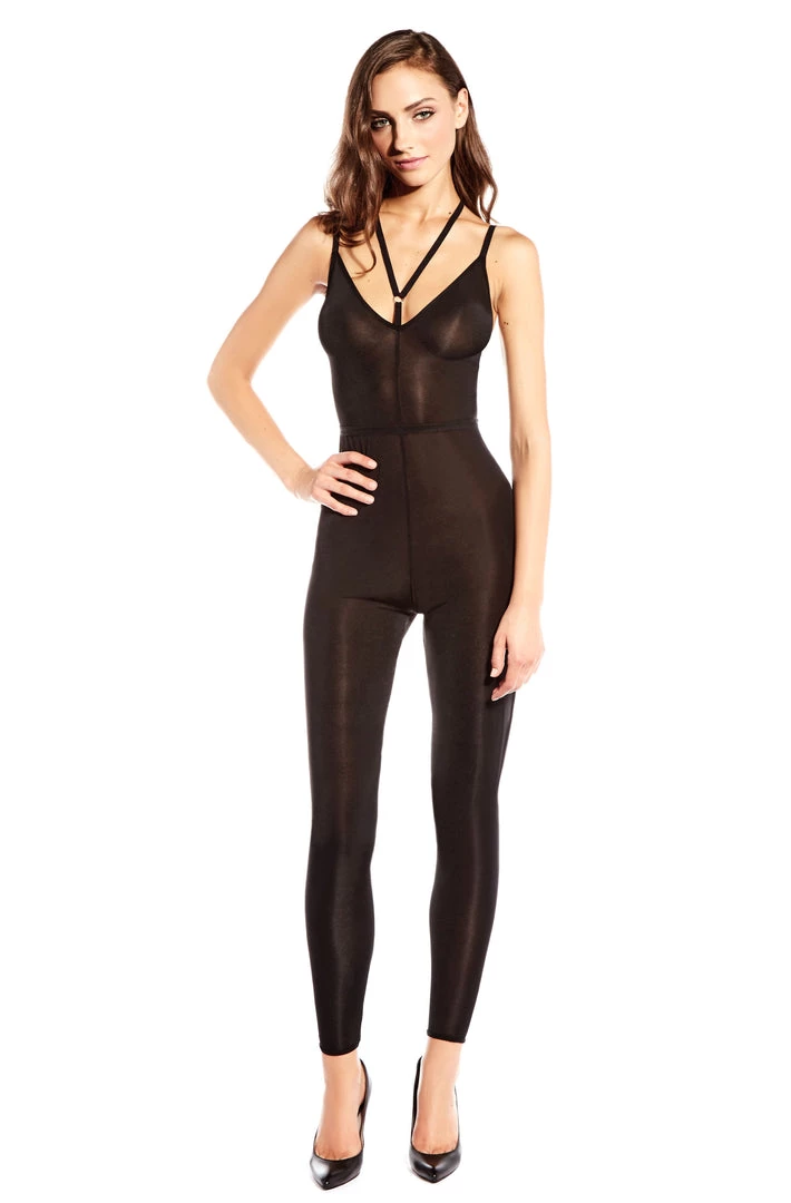 Strappy microfiber catsuit w/ adjustable shoulder straps.
