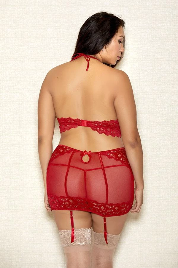 Show off those curves in this sultry halter bralette 3 PC set with tie back, garter skirt and g-string.