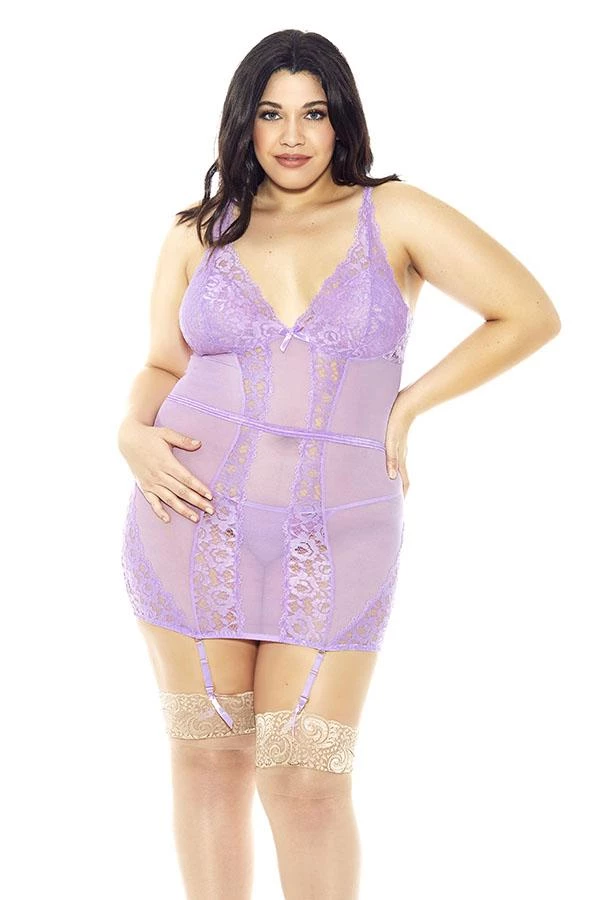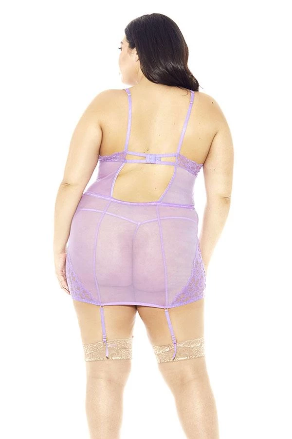 Stunning soft cup chemise with cage back, adjustable straps, garters and g-string.