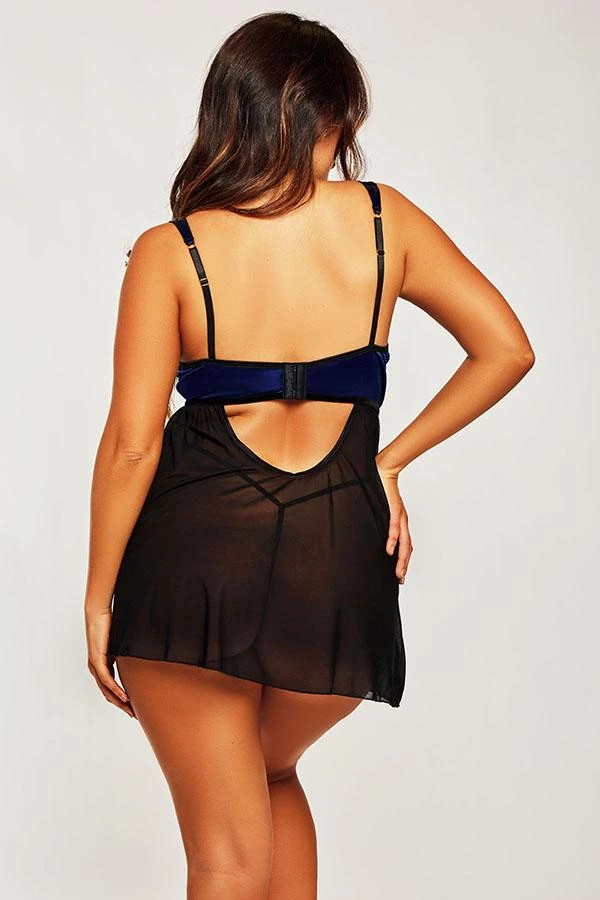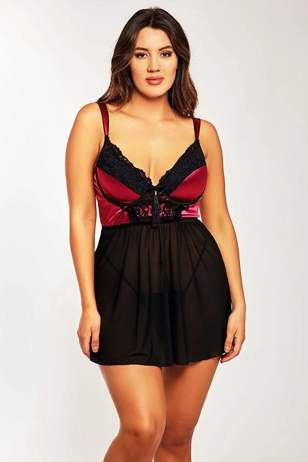 Feel like a goddess in this beyond gorgeous padded cup babydoll with tassel at center front, velvet binding, mesh skirt and hook and eye closure.