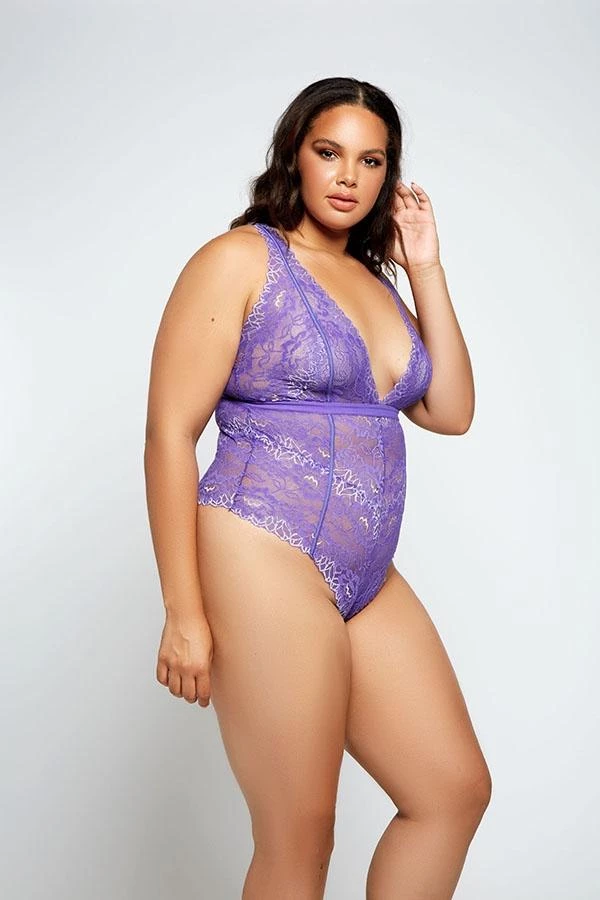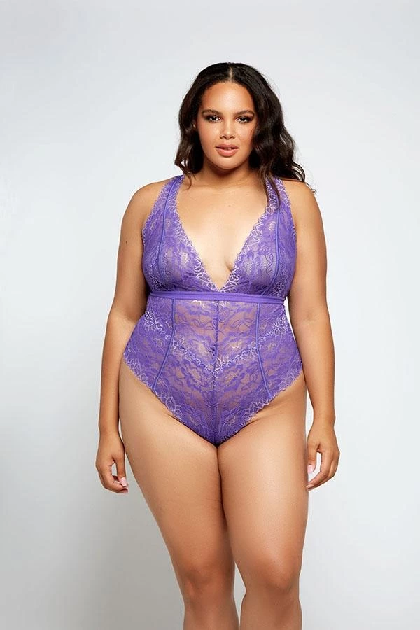 Flirty & sweet galloon lace teddy with high leg cut, plunging neckline and ribbon tie back.