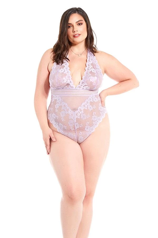 Halter soft cup lace teddy with stripe elastic detail and snap crotch.