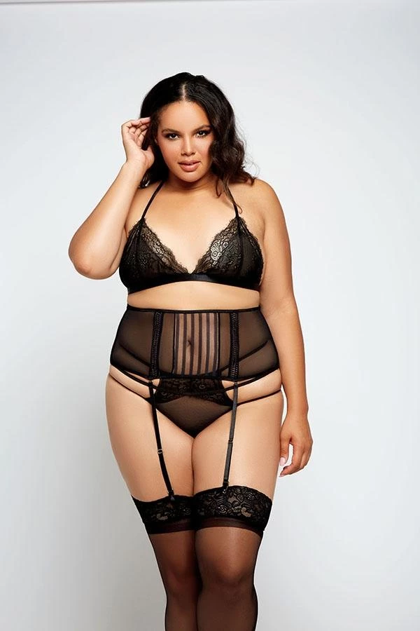 Elegant and sexy soft cup eyelash lace bralette with halter tie, slider back closure, mesh waist cincher with stripe mesh panel, criss cross trim, removable garters, lace up back closure and matching strappy mesh g-string.