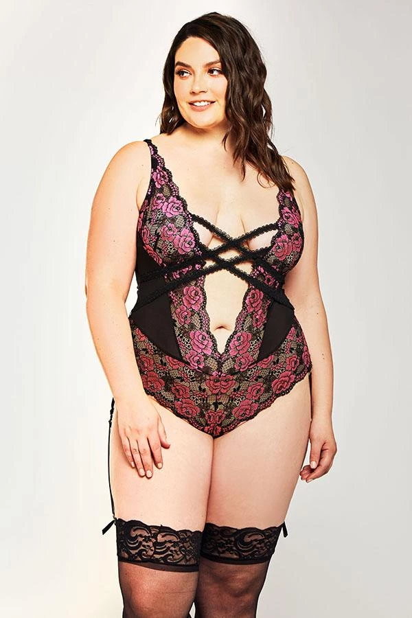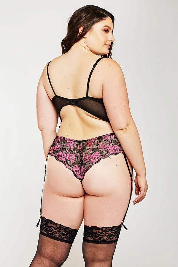Sweet & sexy soft cup plunge teddy with galloon lace and novelty elastic side strap from front to back. Open back detail, hook and eye closure and garters.