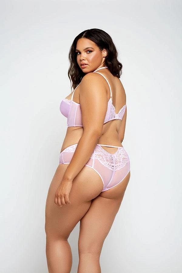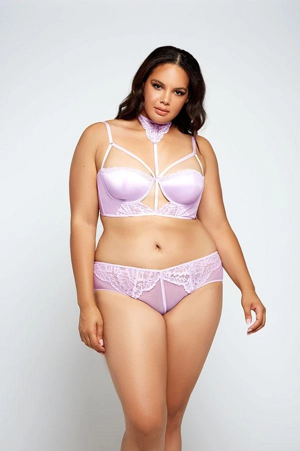 Galloon lace and mesh longline bra with lace choker, satin padded cups, center front keyhole, and hook and eye closure and matching mesh hipster panty with keyhole back.