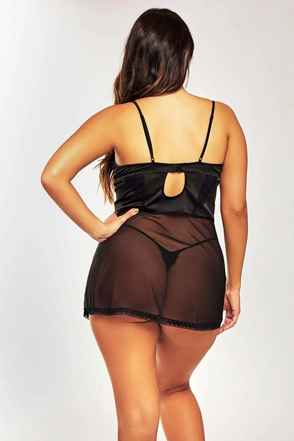 Sleek & sultry peek-a-boo padded bra cup babydoll with mesh skirt, keyhole back and matching g-string.