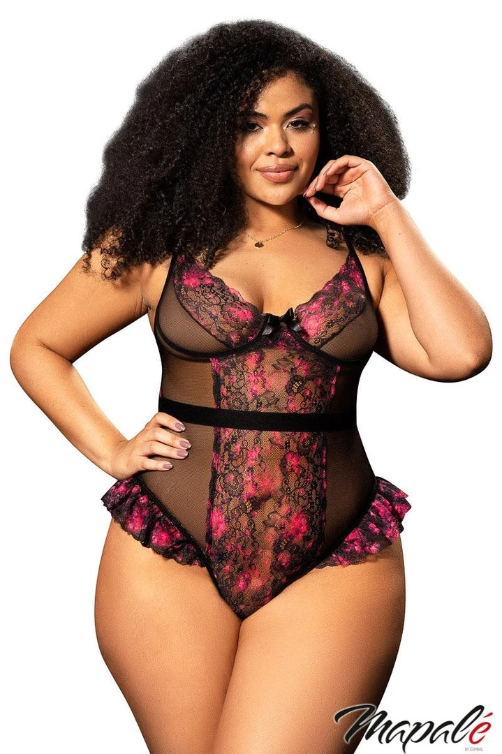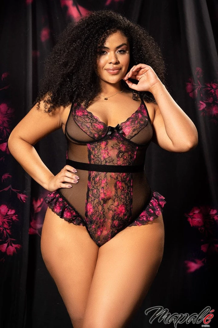 A delicate bodysuit that combines the sensuality of the transparency and femininity of flowers, as well as a flirtatious ruffles on the legs. Adjustable straps, front ring detail and adjustable hook and eye crotch closure.