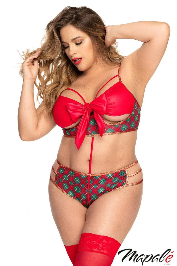 A perfect present for your loved ones! This set includes a bra featuring underwired open cups, a silky adjustable tie-front strap, adjustable straps, and a hook & eye back closure. A plaid thong with strappy open sides, a top hook to attach/detach from the bra to create a teddy look, and an open strappy cage back topped by a cute Santa letter accessory.