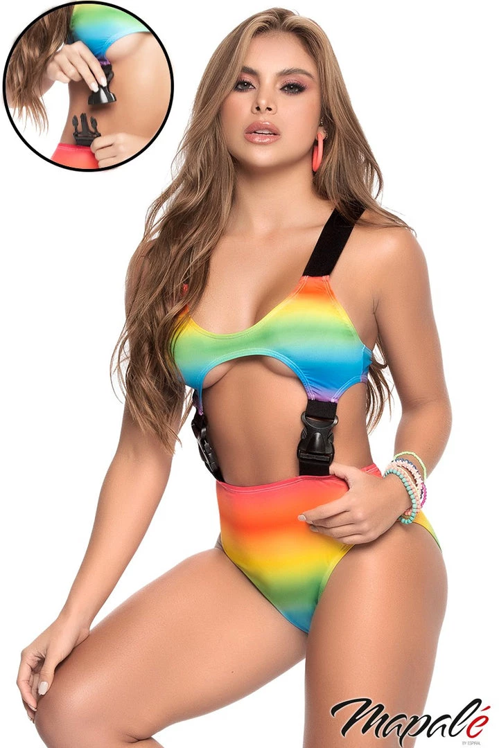 Proud and confident in this opaque rainbow gradient bodysuit with thick elastic straps, a fully open cutout middle closed by functional plastic clips, and a hook & eye crotch closure.