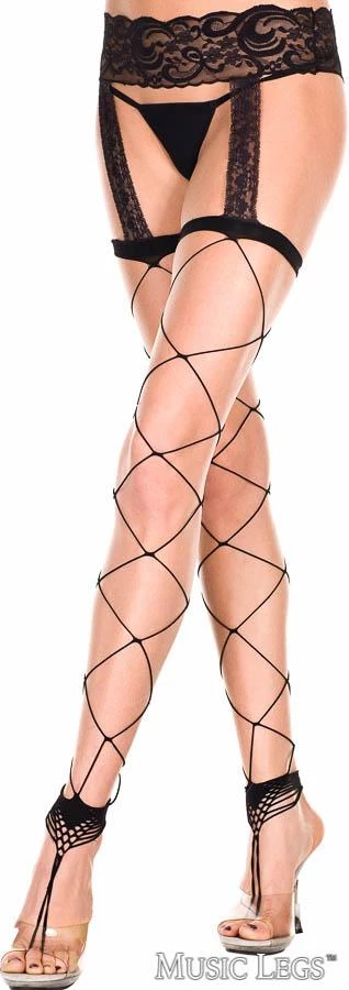 Spandex large diamond net footless stockings with toe ring and lace garter belt.