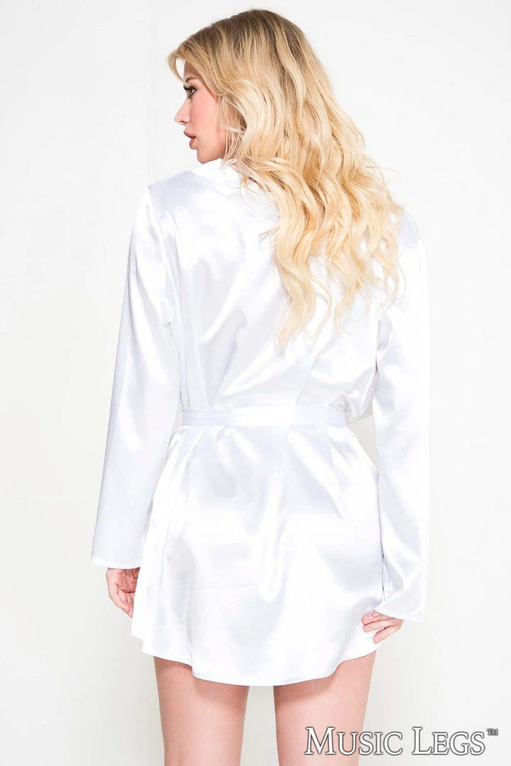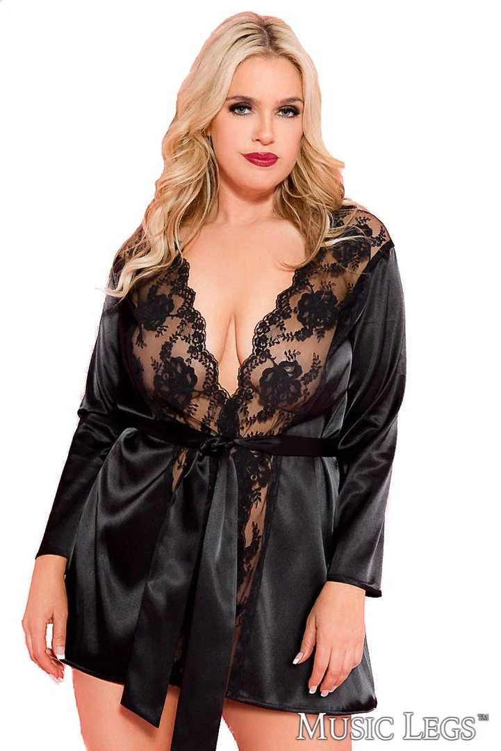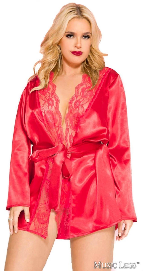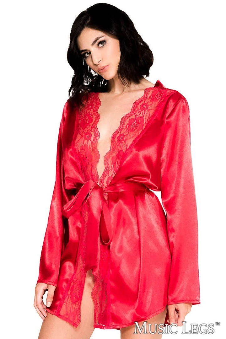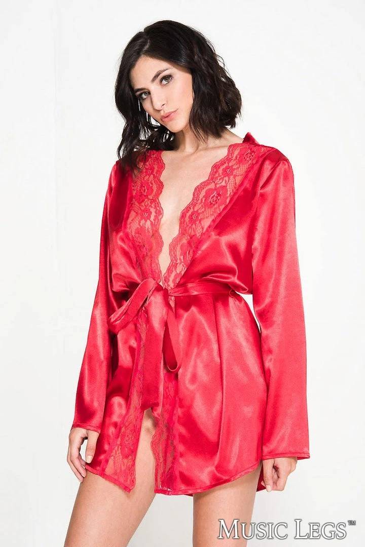 Long sleeve satin robe with lace scalloped trim and satin belt.