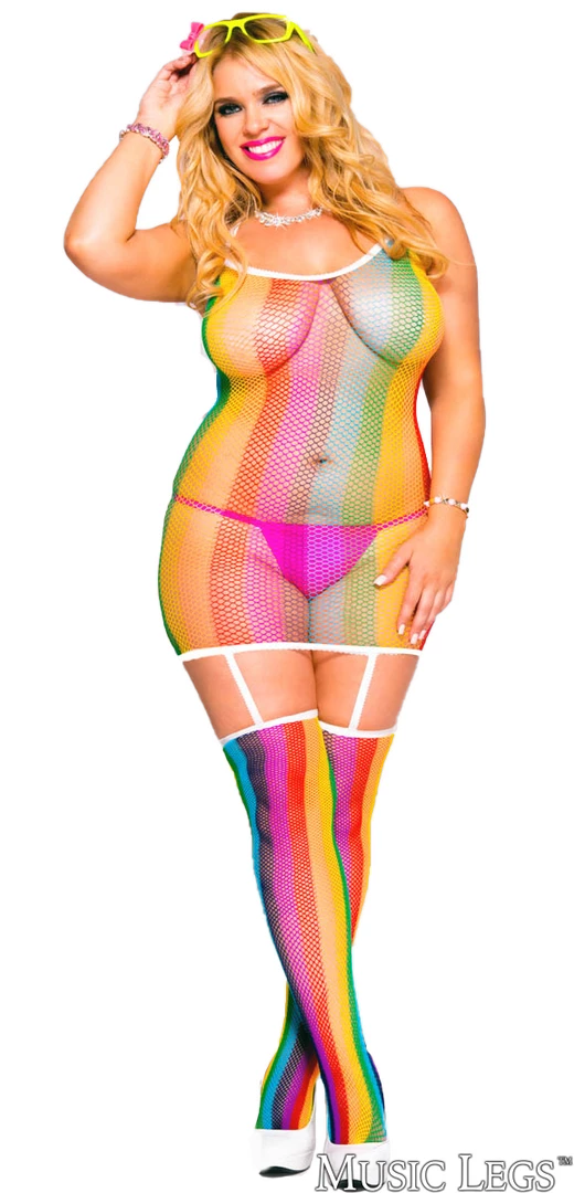 Music Legs Rainbow Stripe Fishnet Garter Dress With Stockings