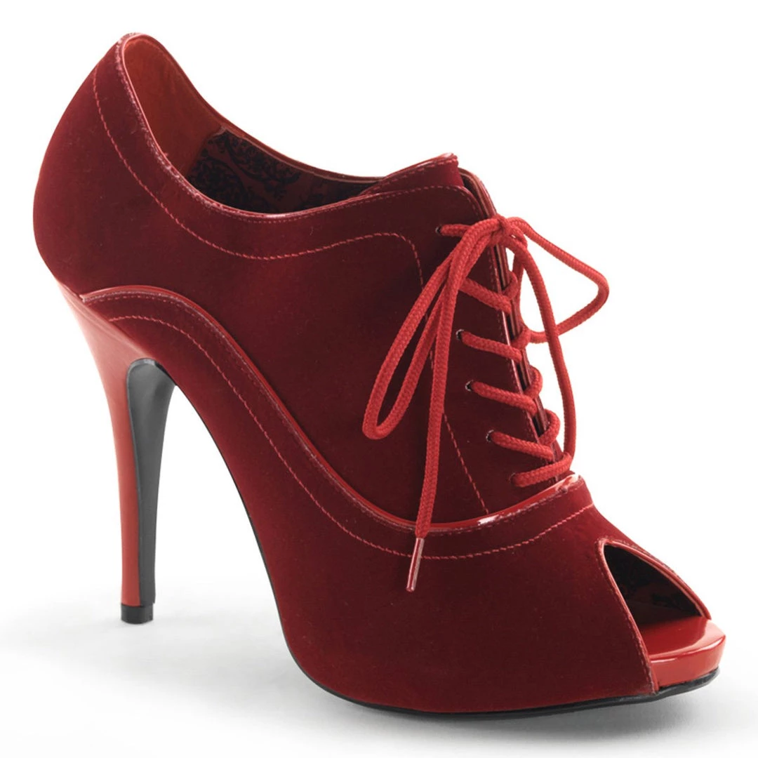 A little menswear styling never looked so feminine. The Bordello by Pleaser Wink-01 open-toe bootie features a peep-toe, dapper lacings and a little menswear seaming. A stiletto heel gives you a flattering lift that is all woman. This high heel lace up peep toe shoe has a velvet upper, a lace up closure, a peep toe, a leather lining, and a rubber bottom. Pair with a dressy pair of trousers or a slim pencil skirt.
